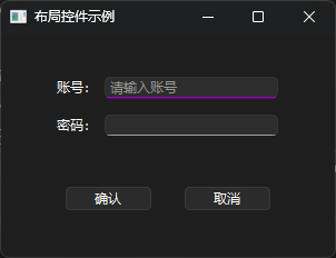 this->resize(300, 200);// 1. 创建中心部件(QMainWindow必须通过中心部件设置布局) QWidget *centralWidget = new QWidget(this); this->setCentralWidget(centralWidget); // 2. 创建控件 QLabel *accountLabel = new QLabel("账号:"); QLineEdit *accountEdit = new QLineEdit(); accountEdit->setPlaceholderText("请输入账号"); QLabel *pwdLabel = new QLabel("密码:"); QLineEdit *pwdEdit = new QLineEdit(); pwdEdit->setEchoMode(QLineEdit::Password); QPushButton *confirmBtn = new QPushButton("确认"); QPushButton *cancelBtn = new QPushButton("取消"); // 3. 创建水平布局(存放两个按钮) QHBoxLayout *btnLayout = new QHBoxLayout(); btnLayout->addStretch(); // 添加伸缩空间(按钮右对齐) btnLayout->addWidget(confirmBtn); btnLayout->addSpacing(20); // 按钮之间间距 btnLayout->addWidget(cancelBtn); btnLayout->addStretch(); // 4. 创建水平布局(存放账号标签和输入框) QHBoxLayout *accountLayout = new QHBoxLayout(); accountLayout->addWidget(accountLabel); accountLayout->addWidget(accountEdit); // 5. 创建水平布局(存放密码标签和输入框) QHBoxLayout *pwdLayout = new QHBoxLayout(); pwdLayout->addWidget(pwdLabel); pwdLayout->addWidget(pwdEdit); // 6. 创建垂直布局(存放所有子布局和控件) QVBoxLayout *mainLayout = new QVBoxLayout(centralWidget); mainLayout->addLayout(accountLayout); mainLayout->addLayout(pwdLayout); mainLayout->addSpacing(30); mainLayout->addLayout(btnLayout); mainLayout->setContentsMargins(50, 30, 50, 30); // 布局边距}