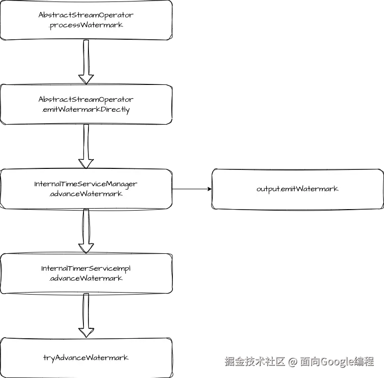本文我们一起梳理了 Watermark 相关的源码,从 Watermark 的定义,到 Watermark 的处理过程。处理过程分成了初始化、上游发送和下游处理三部分。在下游处理部分,关于触发窗口计算的部分我们简单带过了,后面会再详细介绍这部分。