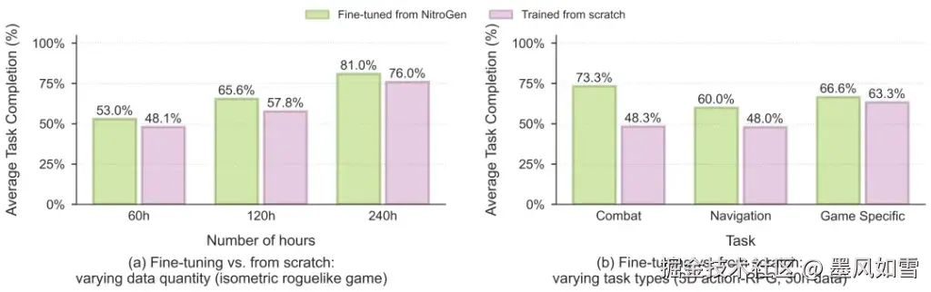 在测试中,即便把NitroGen扔到一个它从未见过的全新游戏里,稍微给点数据微调一下,它的上手速度比从零训练的模型快得多,任务成功率最高能提升52%。这意味着它已经掌握了一套通用的"游戏语法"。