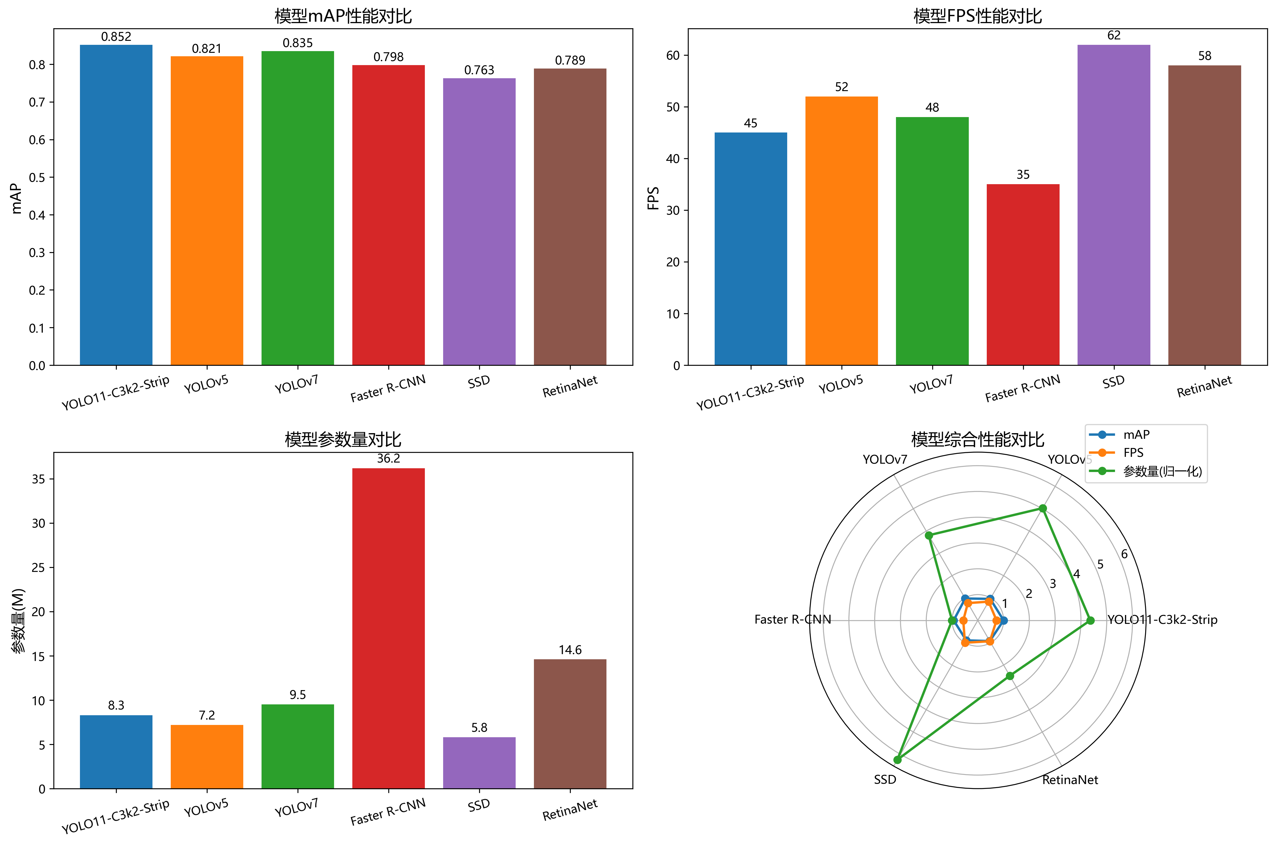 我们还进行了消融实验,验证了C3k2模块和Strip模块的有效性。实验表明,仅使用基础YOLO11模型时,mAP为86.5%;加入C3k2模块后提升至89.7%;进一步加入Strip模块后达到92.3%,证明我们的改进策略是有效的。