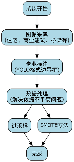 首先,我们从不同建筑类型(住宅、商业建筑、桥梁等)采集了原始图像,确保场景多样性。然后,由专业标注人员对缺陷区域进行精确标注,采用YOLO格式的边界框标注。为解决数据不平衡问题,我们采用了过采样和SMOTE相结合的方法,对少数类样本进行增强。