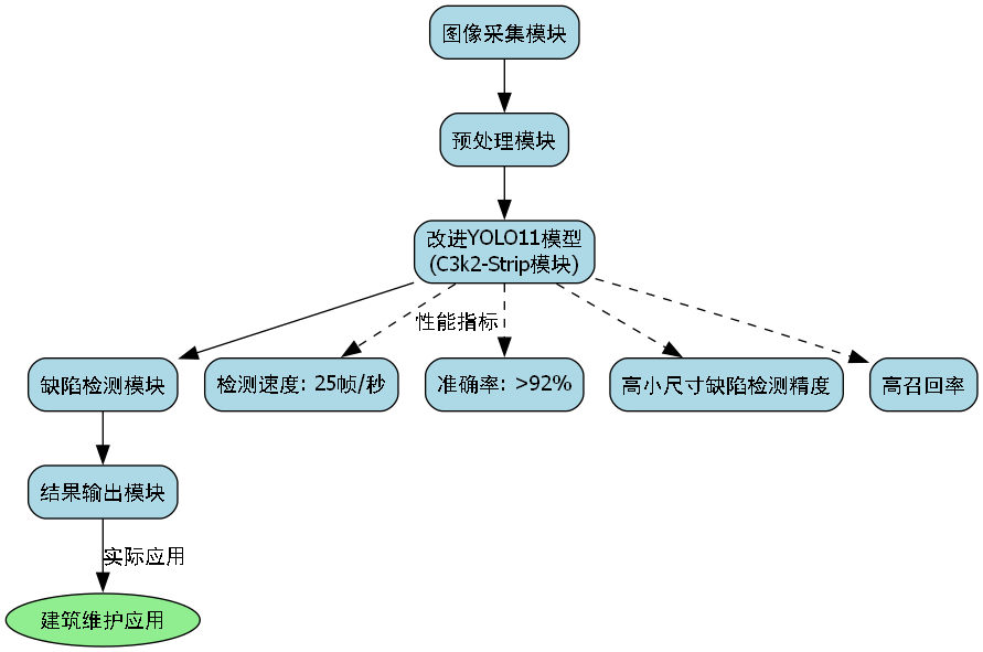 基于训练好的YOLO11-C3k2-Strip模型,我们构建了一套完整的建筑物表面缺陷检测系统。该系统采用模块化设计,包含图像采集、预处理、缺陷检测、结果可视化和报告生成五大模块,各模块协同工作,实现了从原始图像到检测报告的全流程自动化。