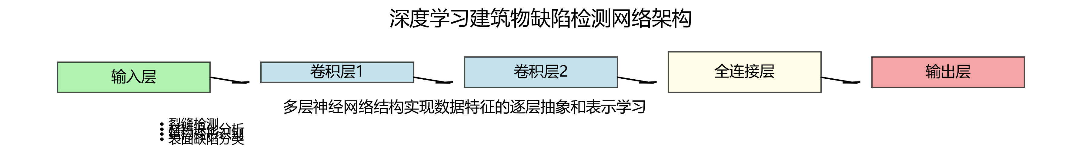 卷积神经网络(CNN)是深度学习的核心架构之一,其通过卷积层、池化层和全连接层的组合,实现了对图像特征的层级化提取。CNN的核心优势在于局部感受野、权值共享和下采样机制,这些特性使CNN能够有效捕捉图像的空间特征并减少参数数量。在建筑物缺陷检测中,CNN能够自动学习缺陷的纹理、形状和结构特征,避免了传统方法中手工设计特征的局限性。