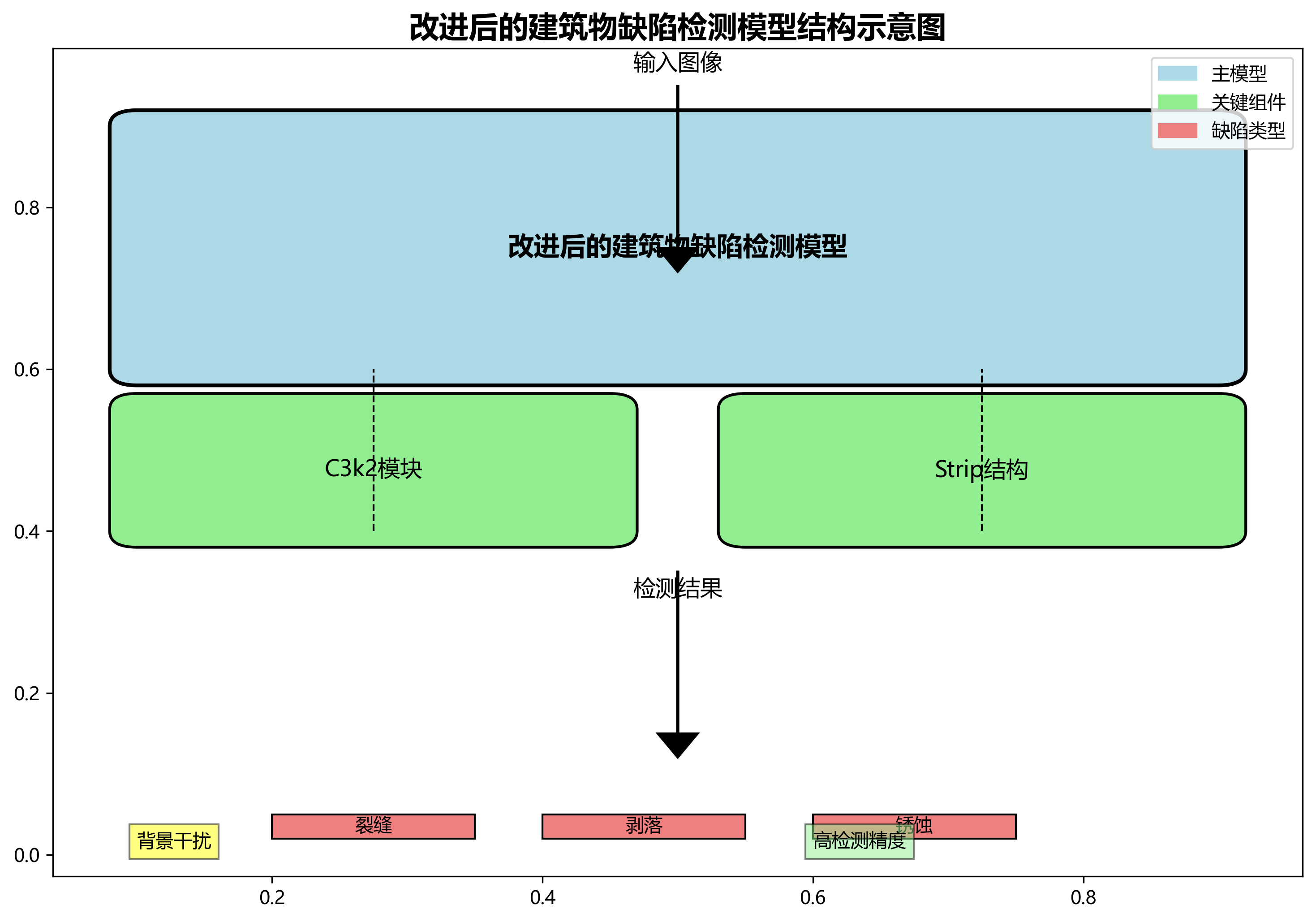 从图5可以看出,改进后的模型能够准确检测各种类型的建筑物缺陷,包括裂缝、剥落、锈蚀等,并且对背景中的干扰具有较强的鲁棒性。特别是在复杂背景下,模型仍然能够保持较高的检测精度,这得益于C3k2模块和Strip结构的有效应用。