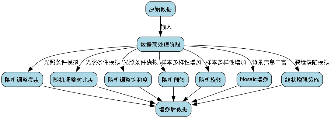 数据预处理阶段,我们采用了多种增强策略:随机调整亮度、对比度和饱和度以模拟不同光照条件;随机翻转和旋转以增加样本多样性;Mosaic增强将四张图像拼接成一张,丰富了背景信息。特别是对于裂缝类缺陷,我们还设计了专门的线状增强策略,通过随机生成不同长度和角度的线段来模拟真实裂缝的形态。