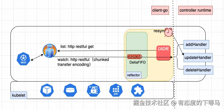 apiserver-->reflector(拉取/监听)-->DeltaFiFO(队列)--> Process(处理)-->Handler(用户代码)
