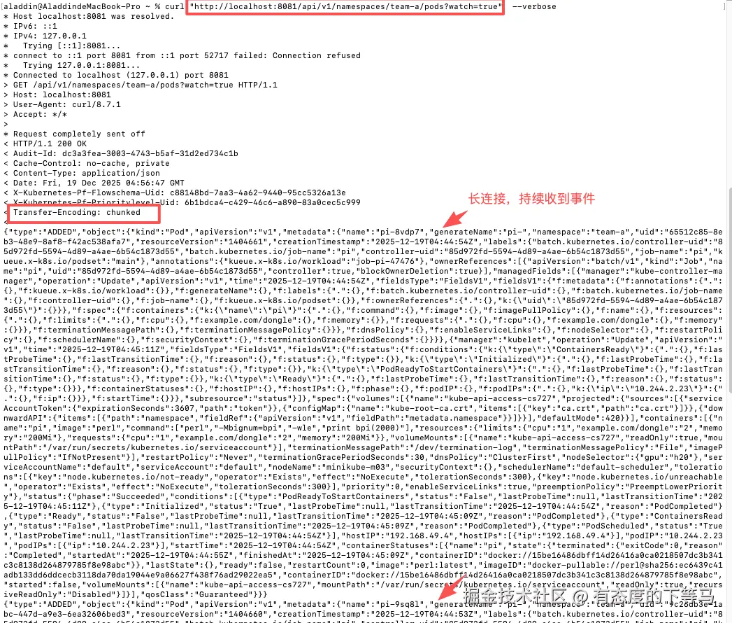 请求spiserver时查询参数加上watch=true, 会提示服务器本次是监听请求 响应核心特征是响应头包含Transfer-Encoding: chunked