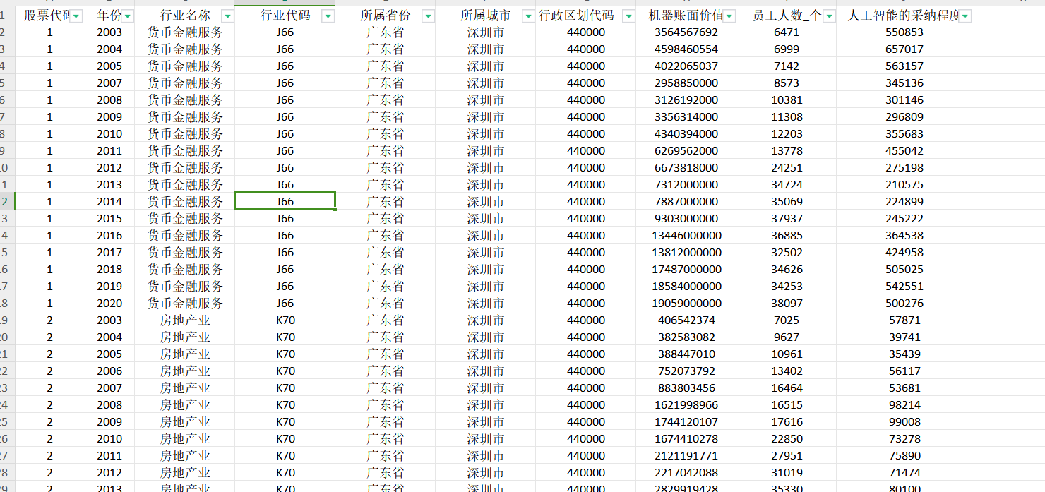 3、指标:股票代码、年份、行业名称、行业代码、所属省份、所属城市、行政区划代码、机器账面价值、员工人数_个、人工智能的采纳程度