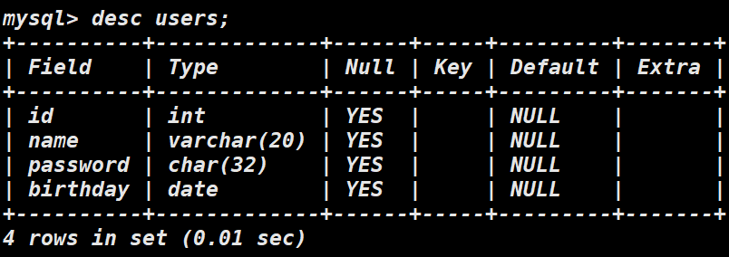 field 为字段名字,type 是字段类型,NULL 为约束条件,key 索引