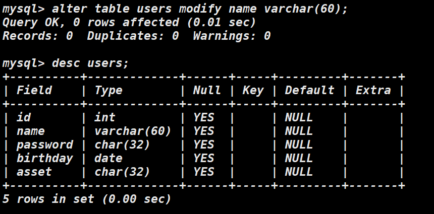 若我们想改变表中字段的数据类型