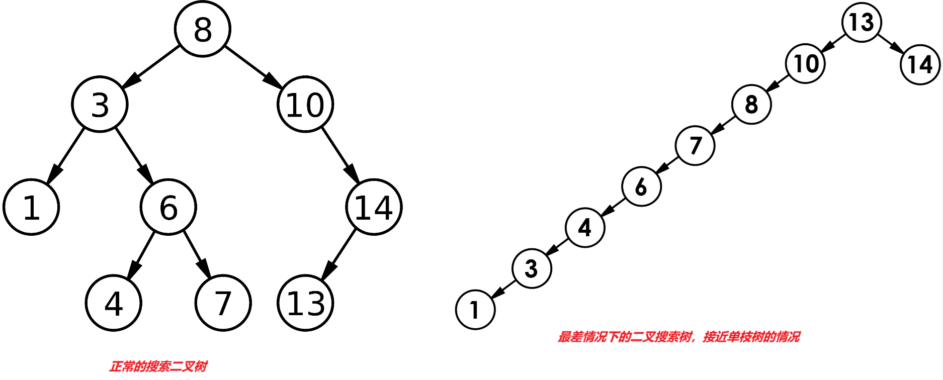 最差情况下,⼆叉搜索树退化为单⽀树(或者类似单⽀),其⾼度为: N