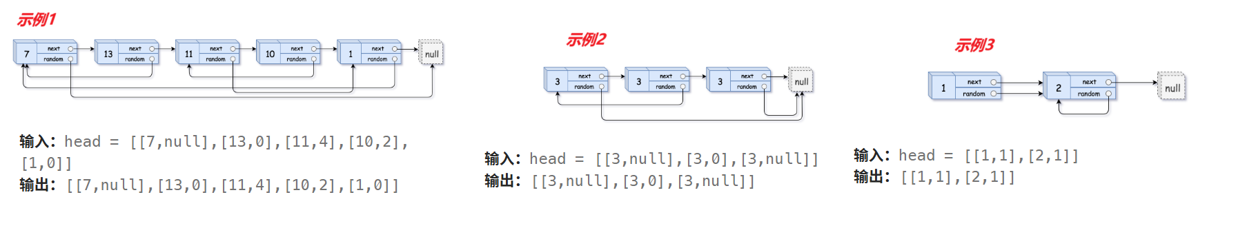 构造这个链表的 深拷贝 。 深拷贝应该正好由 n 个 全新 节点组成,其中每个新节点的值都设为其对应的原节点的值。新节点的 next 指针和 random 指针也都应指向复制链表中的新节点,并使原链表和复制链表中的这些指针能够表示相同的链表状态。复制链表中的指针都不应指向原链表中的节点。