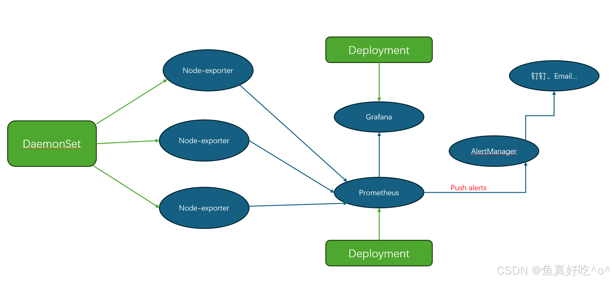 - 告警处理:Alertmanager 接收告警后,通过去重、分组、路由(如 "节点告警发送给运维组,应用告警发送给开发组"),最终以邮件、钉钉、Slack 等方式通知相关人员。