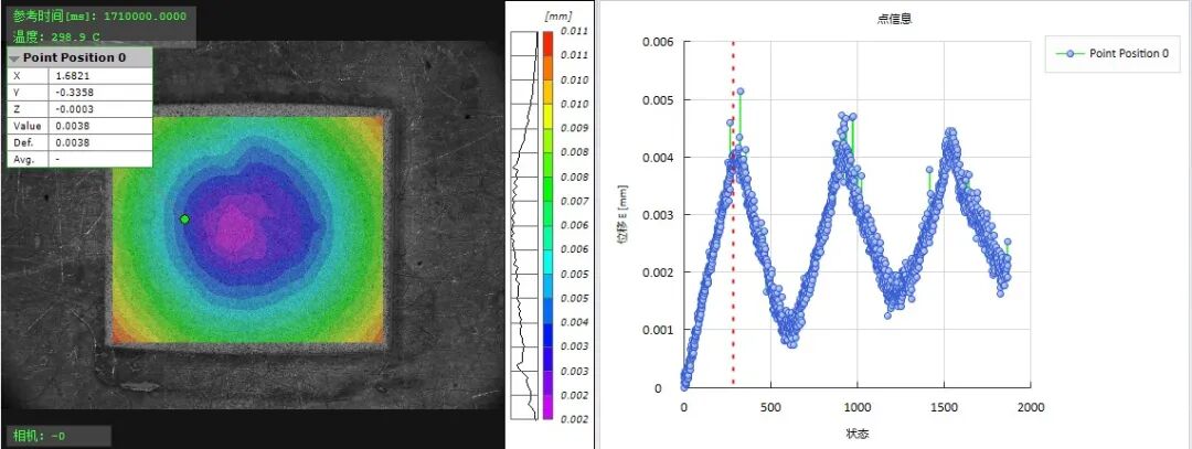 在新拓三维DIC软件中框选散斑域,添加种子点,计算试样随温度变化的变形数据,如下分别为25℃、50℃、100℃、200℃、300℃图例。