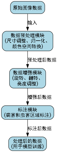 为了训练和评估我们的模型,我们构建了一个包含多种柑橘病害的专用数据集。该数据集包含5,000张标注图像,涵盖柑橘黄龙病、炭疽病、溃疡病等8种常见病害,每种病害约600张图像,以及800张健康柑橘图像。所有图像均在实际柑橘园中采集,并经过专家标注,确保标注质量。