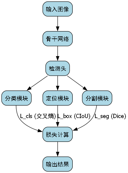 针对柑橘病虫害检测任务,我们设计了多任务损失函数,结合了分类损失、定位损失和分割损失: