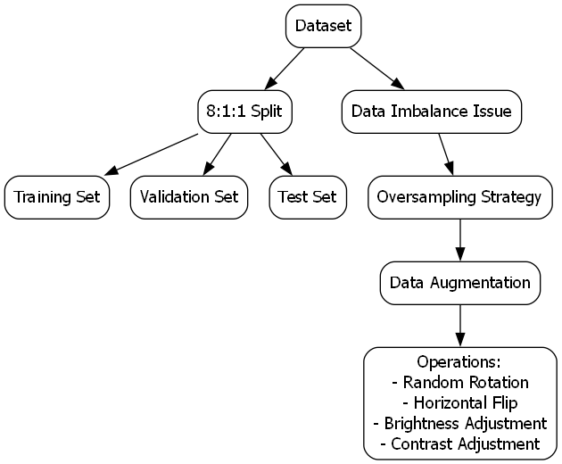 数据集按照8:1:1的比例随机划分为训练集、验证集和测试集。为了解决数据不平衡问题,我们采用了过采样策略,对样本数量较少的品种进行数据增强,包括随机旋转、水平翻转、亮度调整和对比度调整等操作。