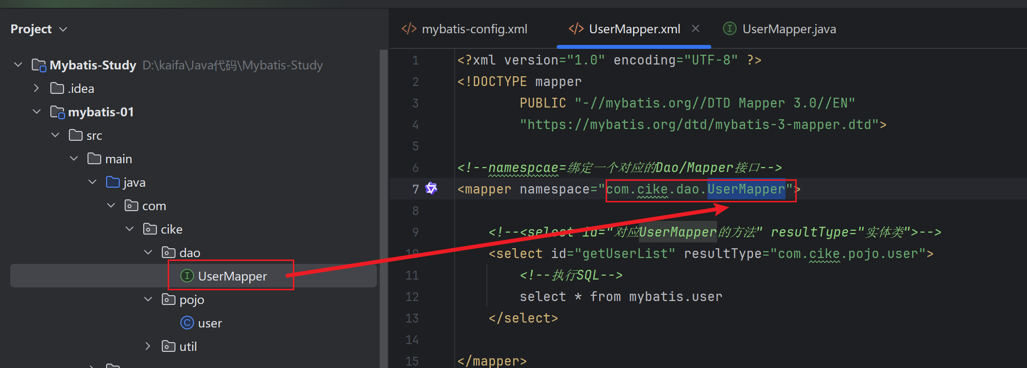 namespace 中的包名要和 Dao/Mapper 接口的包名一致!