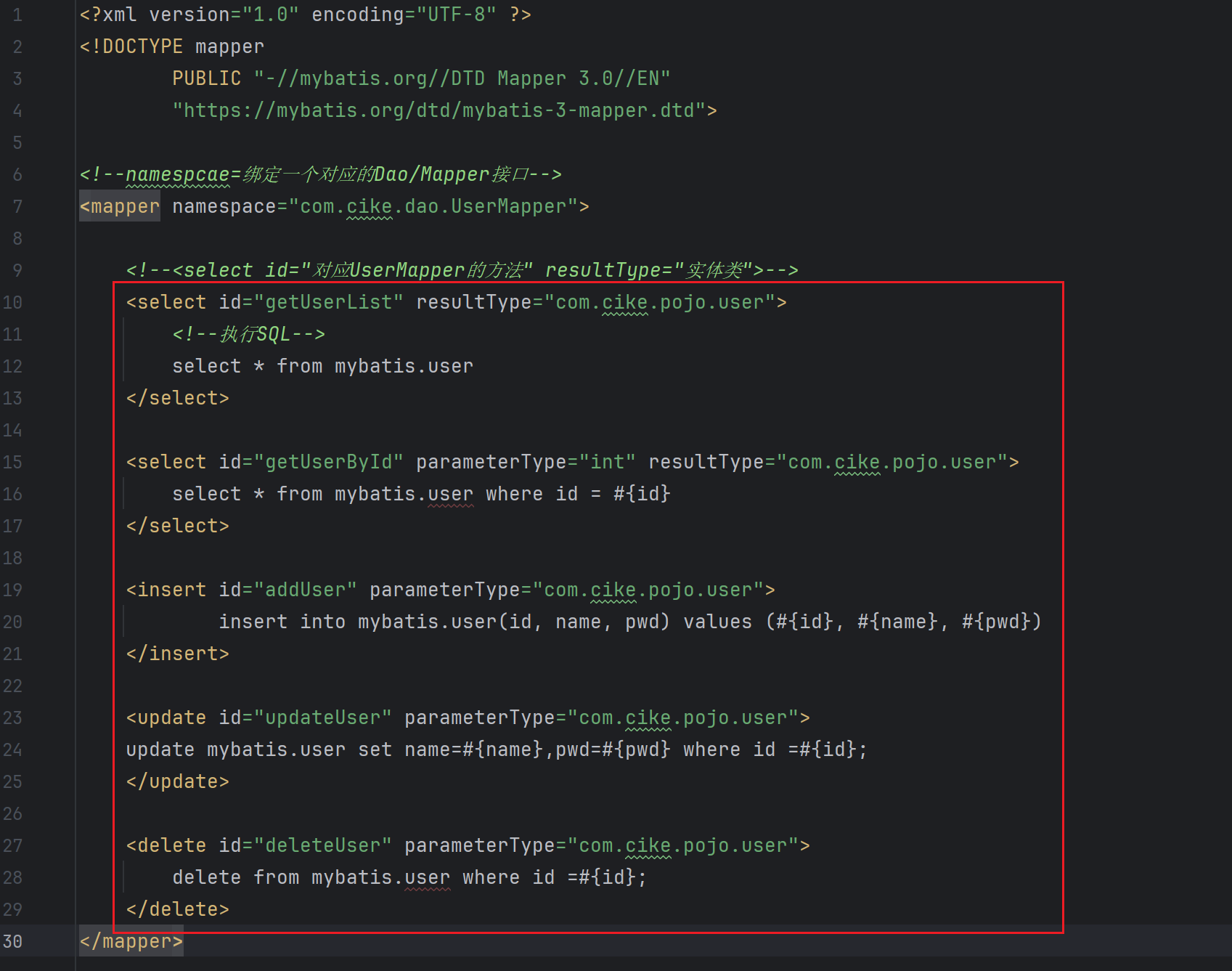 <select id="getUserById" parameterType="int" resultType="com.cike.pojo.user">
