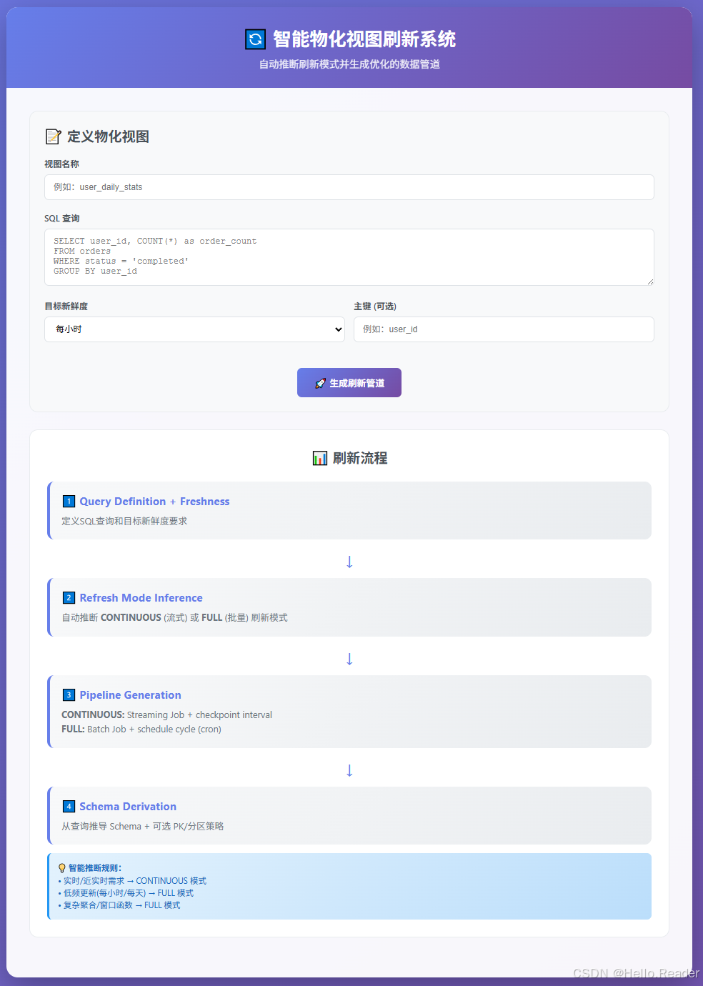- 统一开发体验(同一套 SQL 描述,按新鲜度自动决定跑流还是跑批)