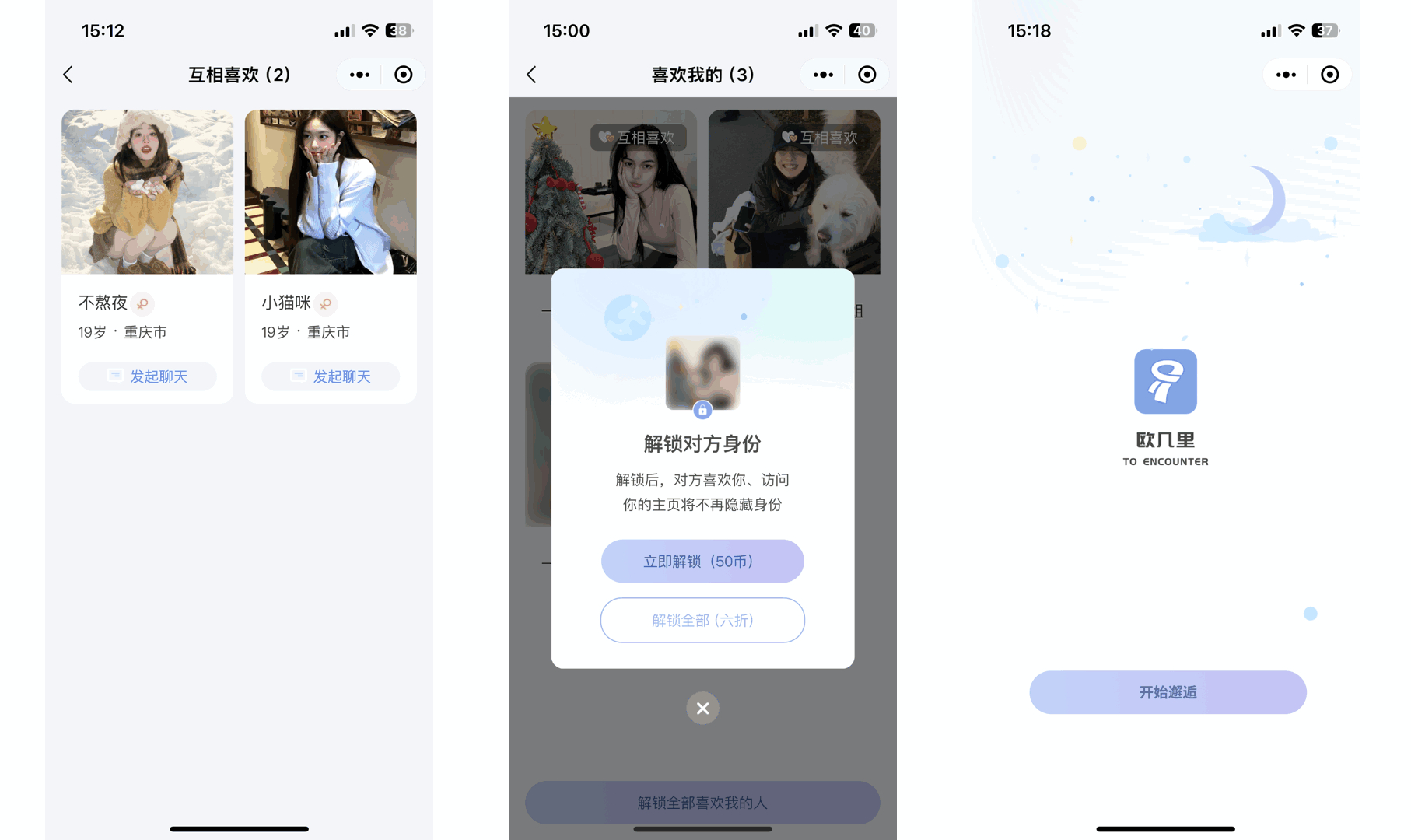 喜欢与互相喜欢:用户可以主动表达喜欢,当双方互相喜欢时,系统会即时通知并开启聊天。