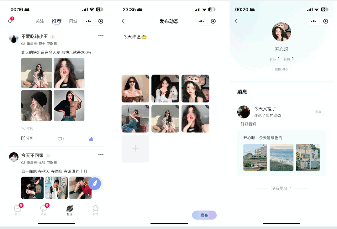 发布动态:用户可以分享生活点滴,支持文字、图片等多种形式。