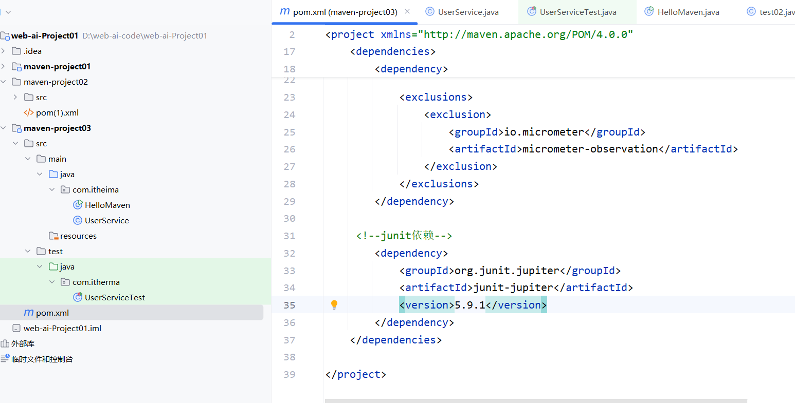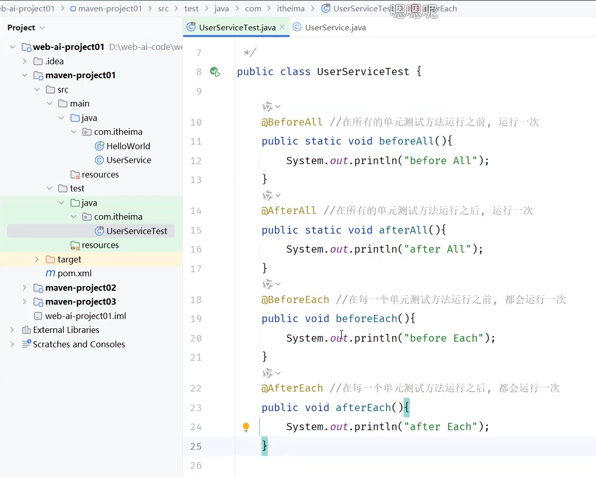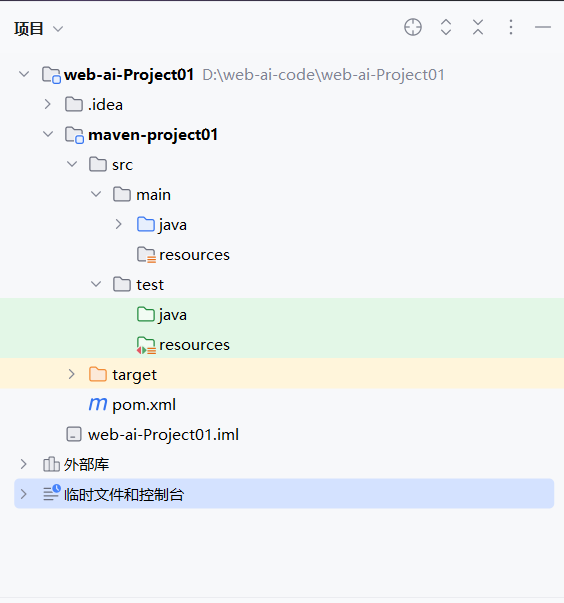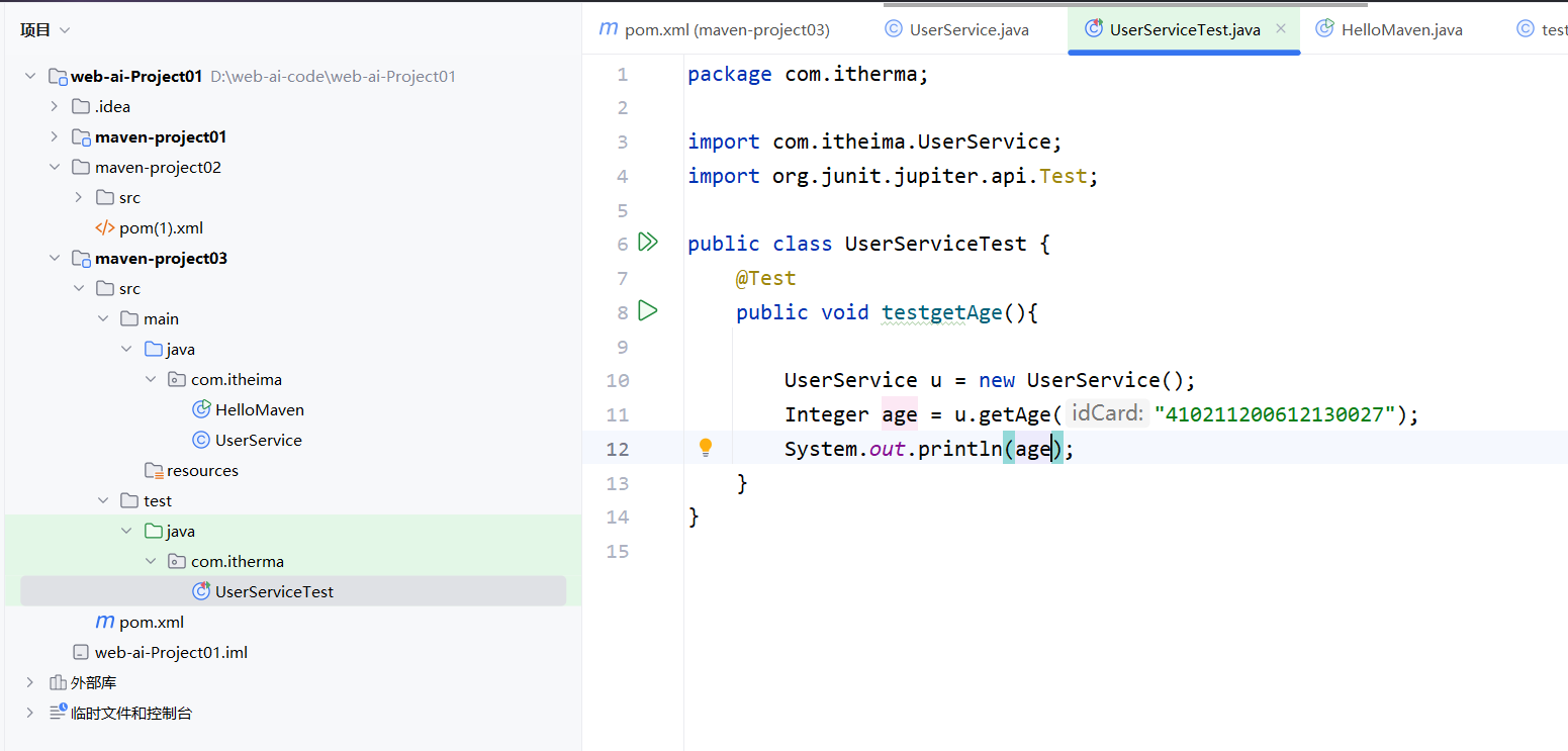 右击web-ai-project01项目,创建 module模块------maven-project01,之后在main的java文件夹下创建com.itheima.Test01 的java运行文件,这样Test01.java文件就可以运行了。