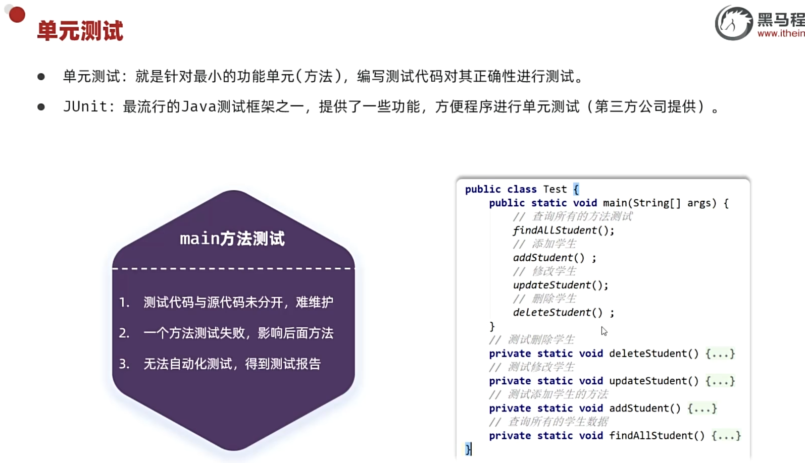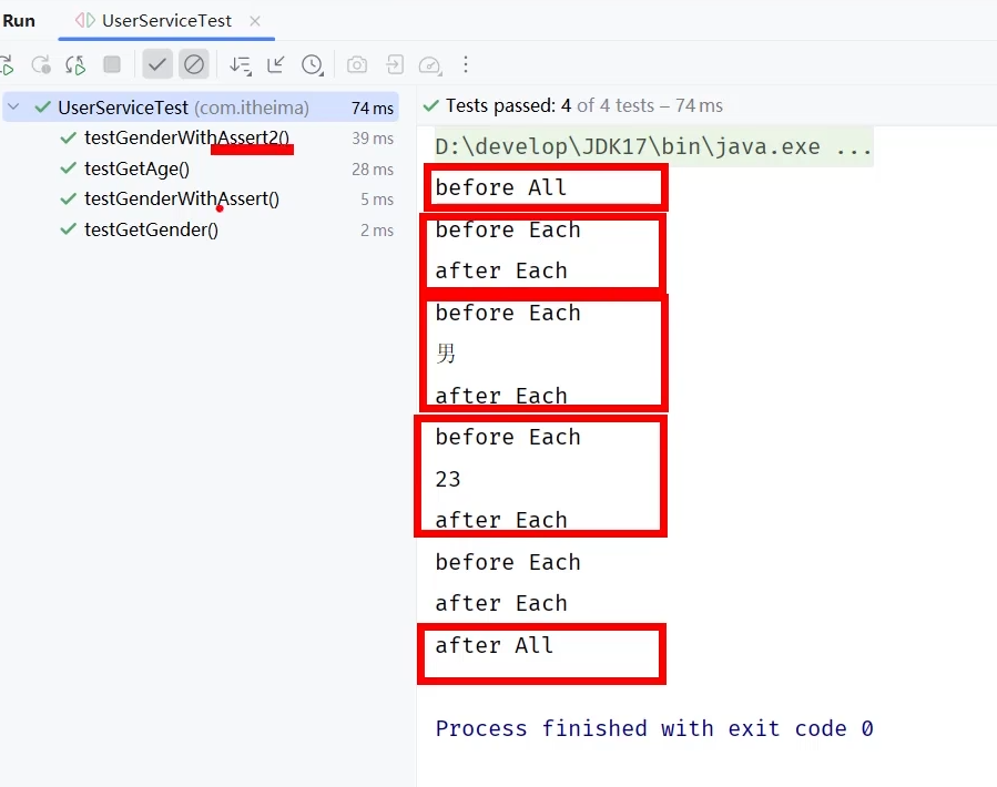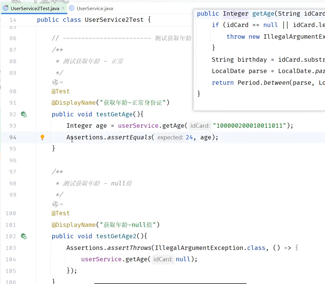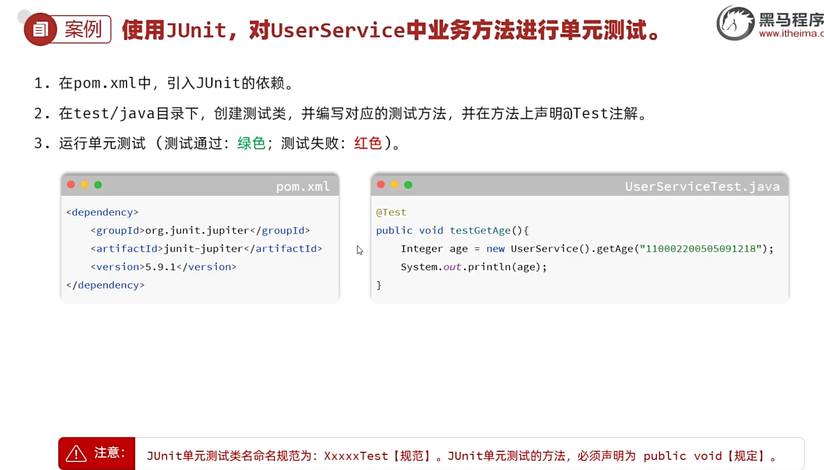 一个单元测试类UserServiceTest可以测试UserService类的所有方法,测试方法自己写,一个测试方法 针对 JavaBean类的某个方法。
