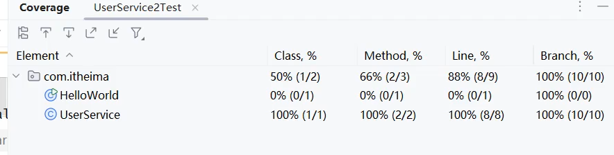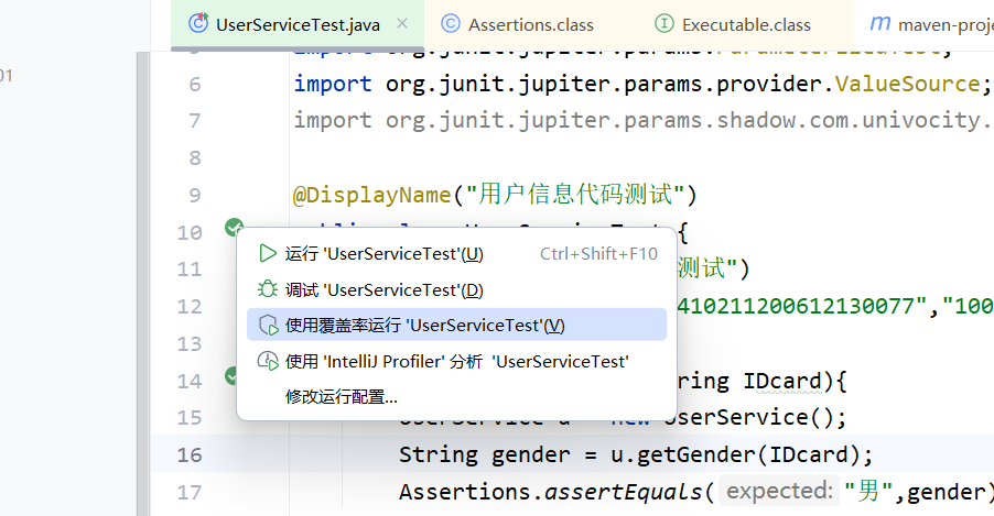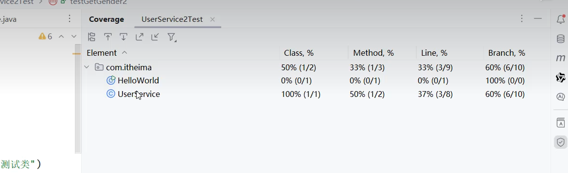 测试了一个类:UserService。测试了该类的一个方法method:getGender。该类的代码只测试了37%。分支是测试了60%