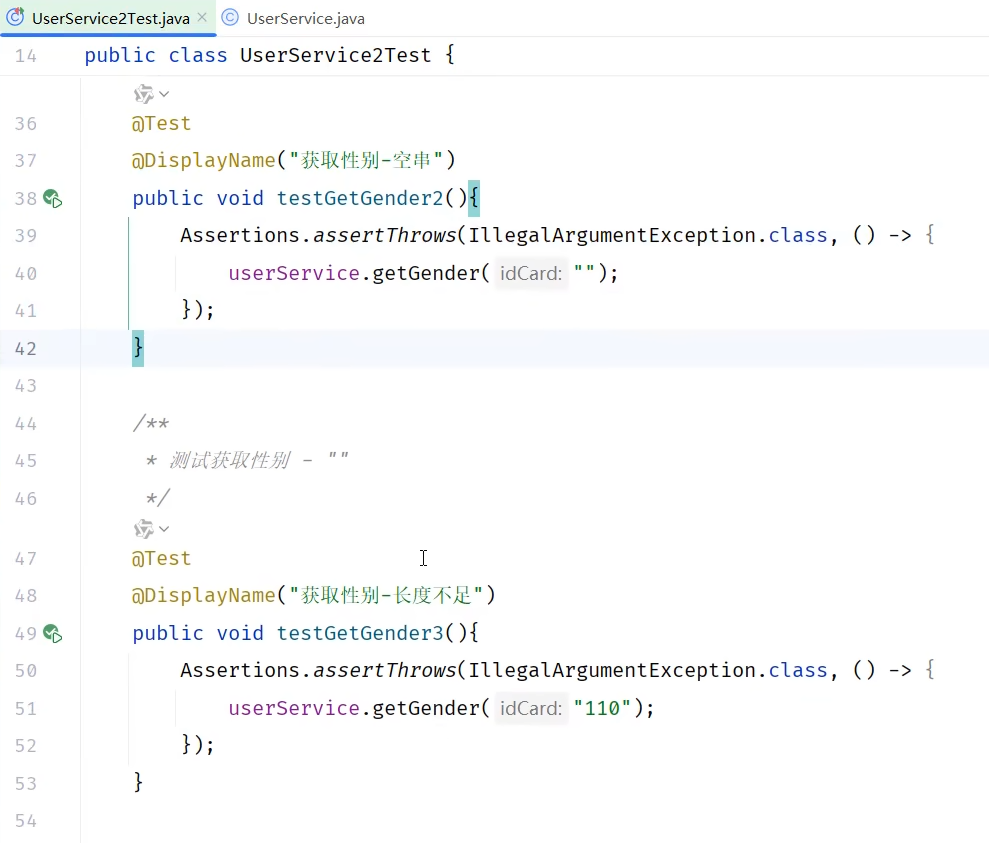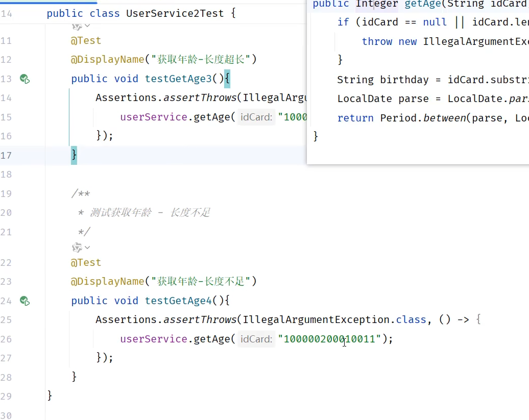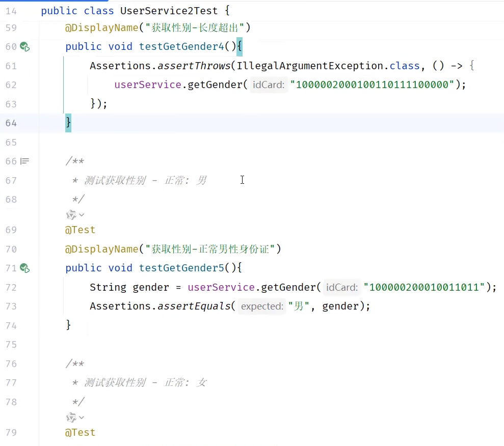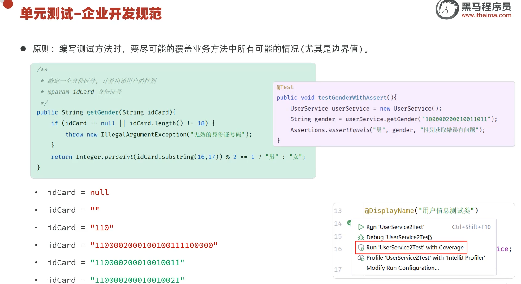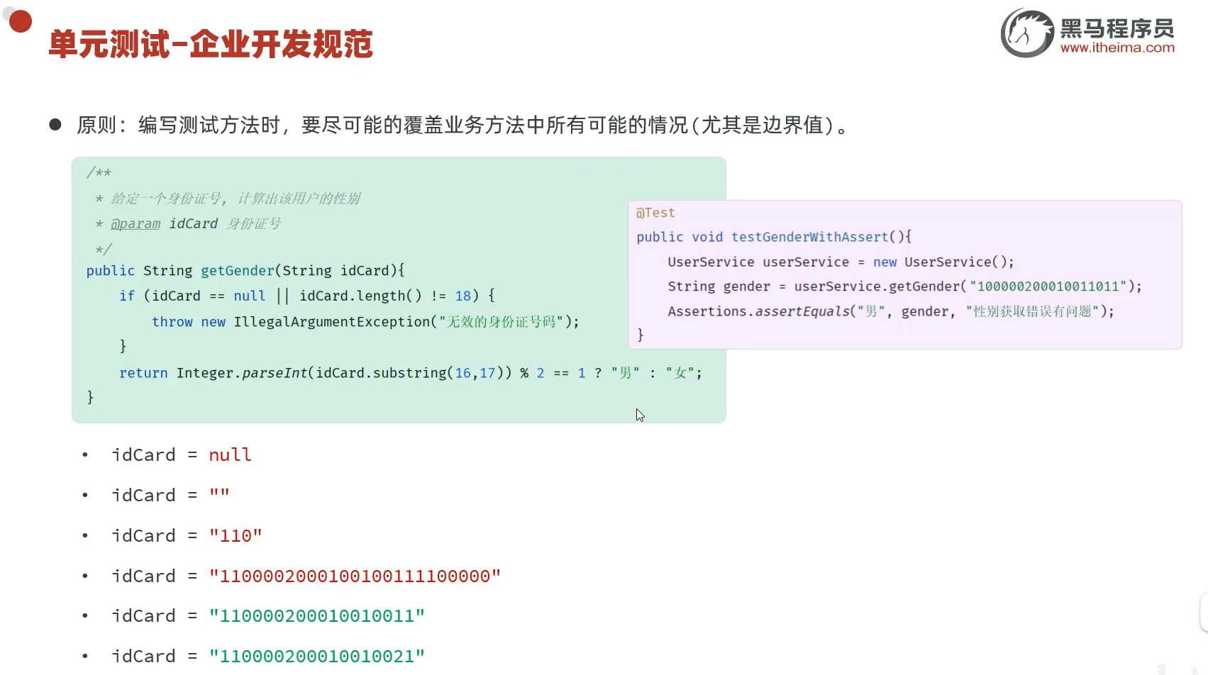 要尽可能的覆盖业务方法(getAge、getGender)中所有可能的情况,特别是边界值。