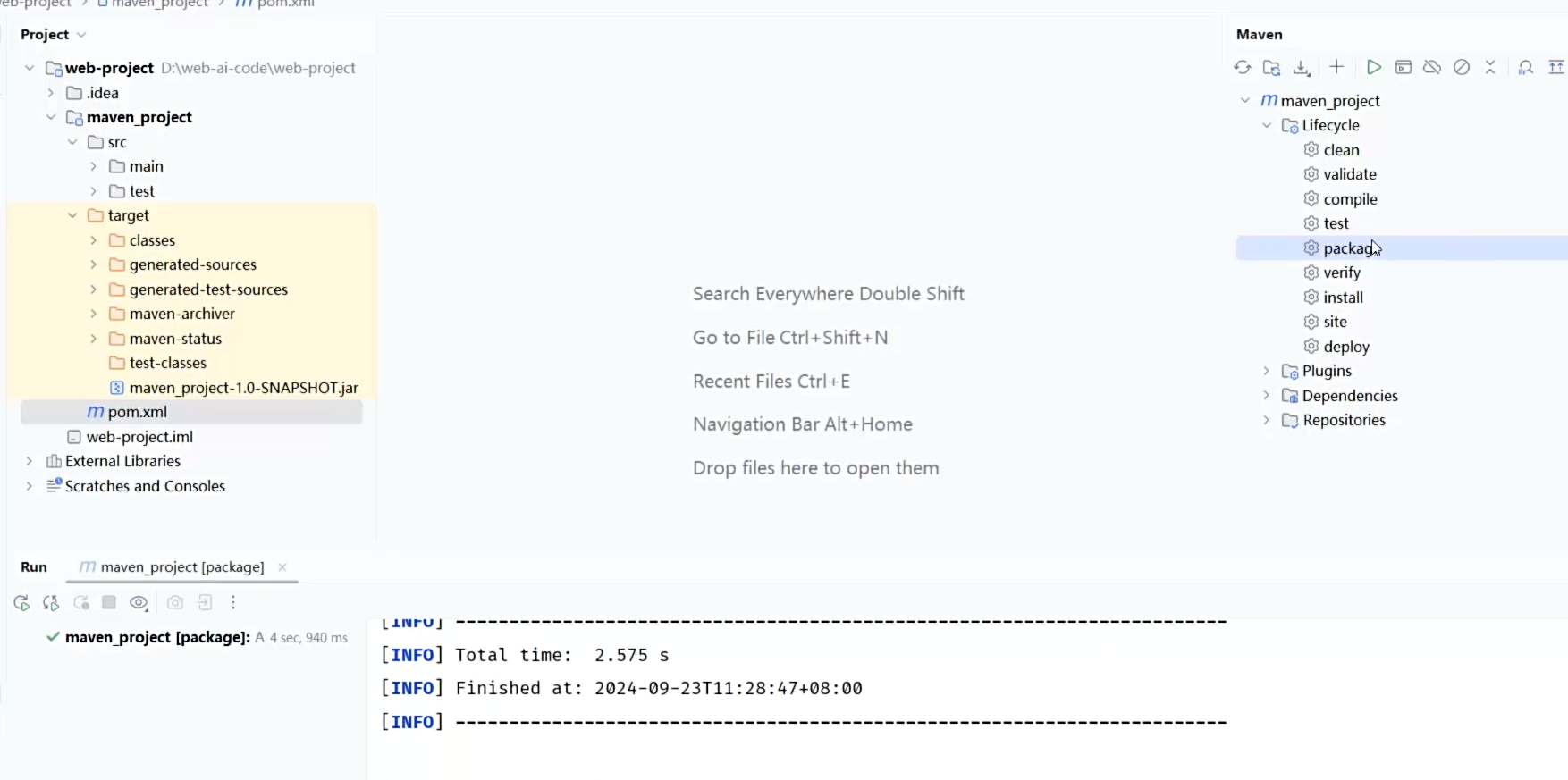 - 只需双击右侧的 compile、test、package指令,就可以完成编译(java文件编译成.class字节码文件)、测试、打包。点击之后在左侧项目栏处就会有target包。
