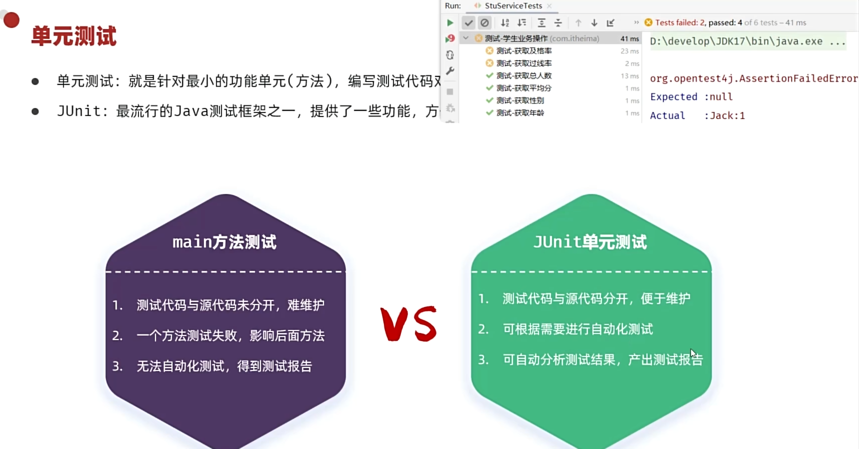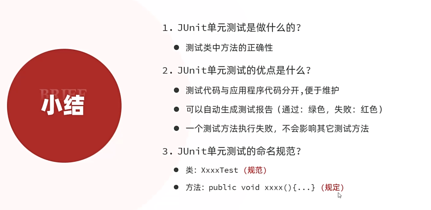 单元测试其实和普通的方法、普通的类没有区别。唯一的区别就是多了个注解 :@Test,(3.4 注解部分)。当一个方法有了@Test这样的注解之后,控制台就可以判断对错。如图: