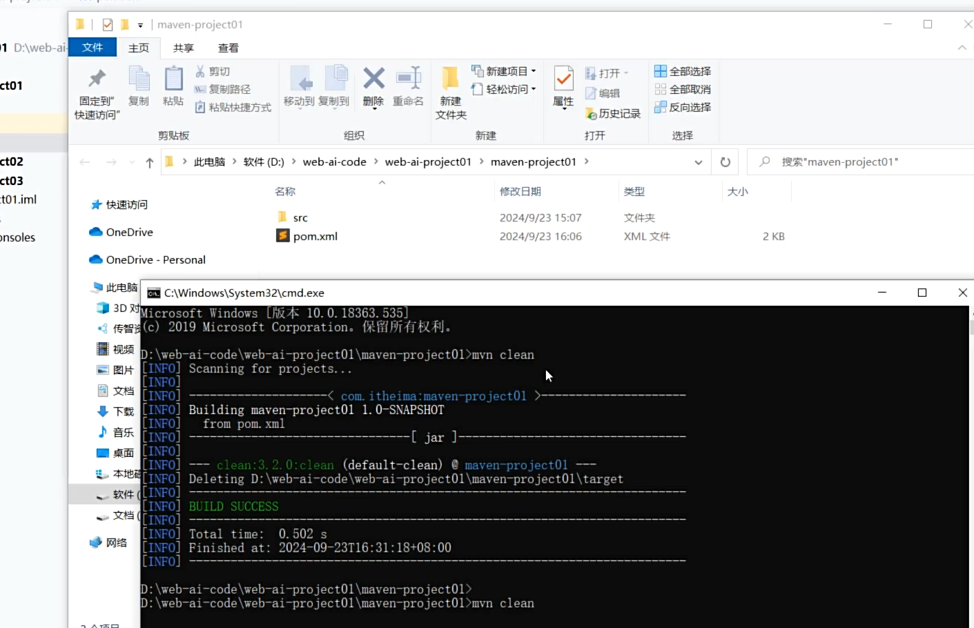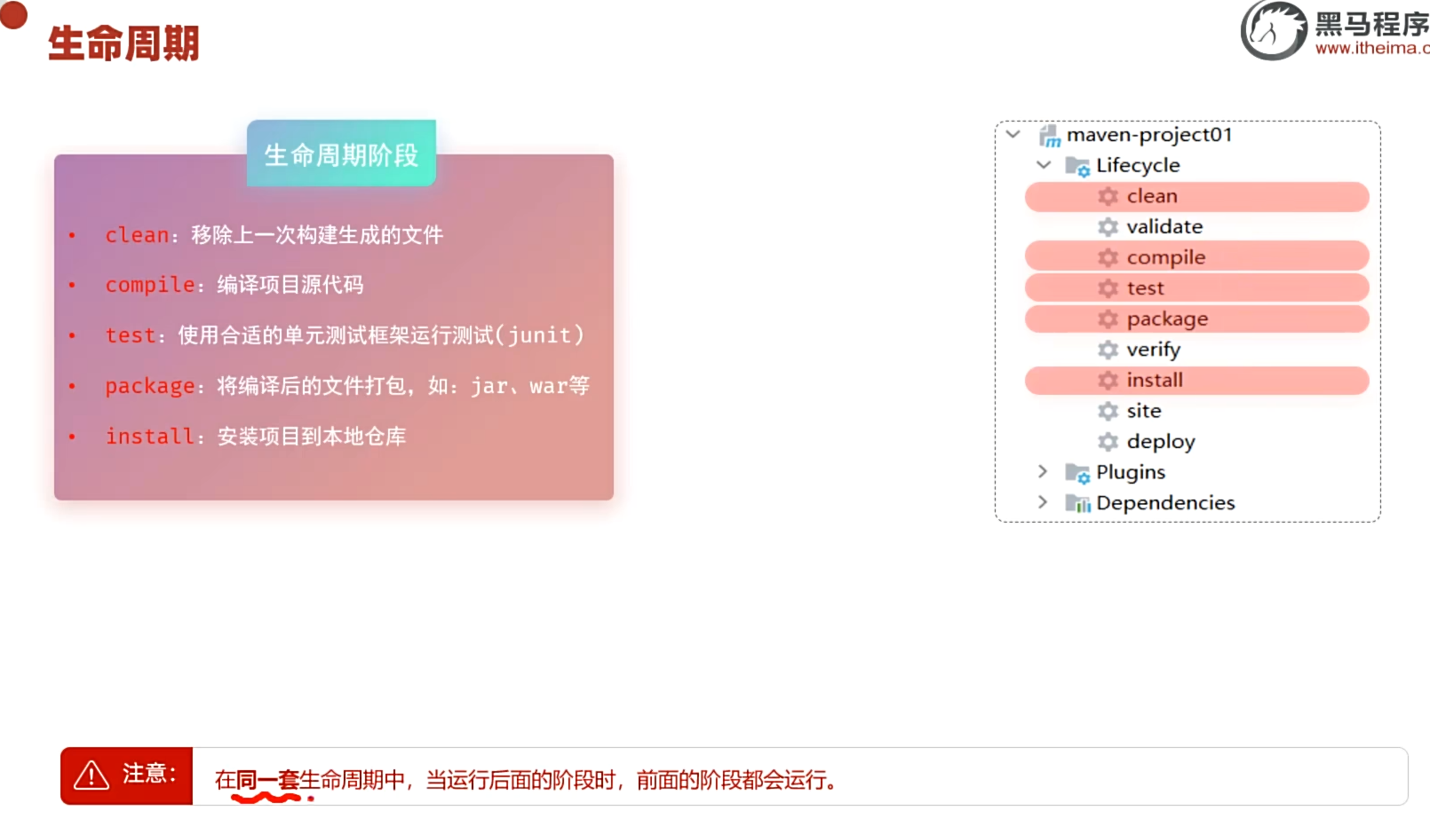 点击install,clean不会执行,因为不属于同一套生命周期,其余的compile、test等可以运行。