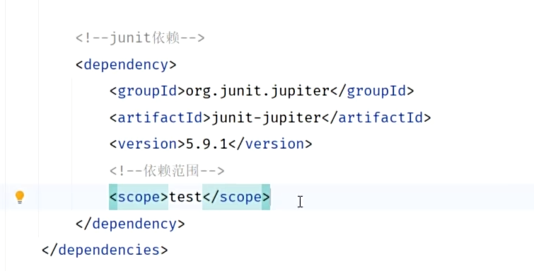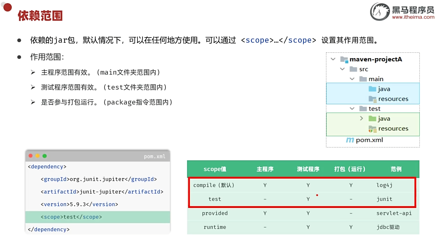 这些所有测试方法,能够测试的原因就是因为JUnit这个依赖jar包,所以我们就可以限制规定这个jar包的使用范围。默认情况下,依赖的jar包是任何地方都能用,所以main主程序就能写单元测试代码。