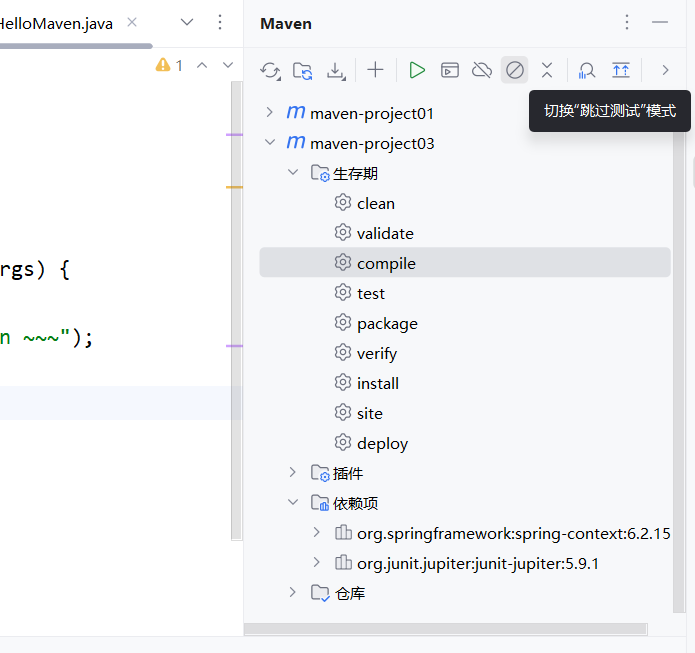 如果双击package打包生命周期,不想让执行测试test阶段(因为前面已经test过了),就点击切换"跳过测试"模式。