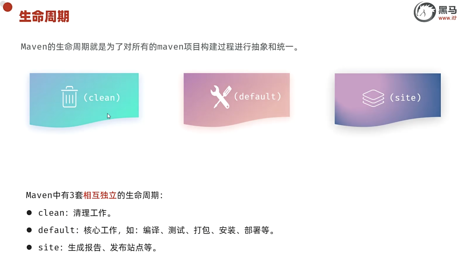 clean:移除上一次项目构建产生的字节码class文件、jar包,其实就是删除对应模块的target目录