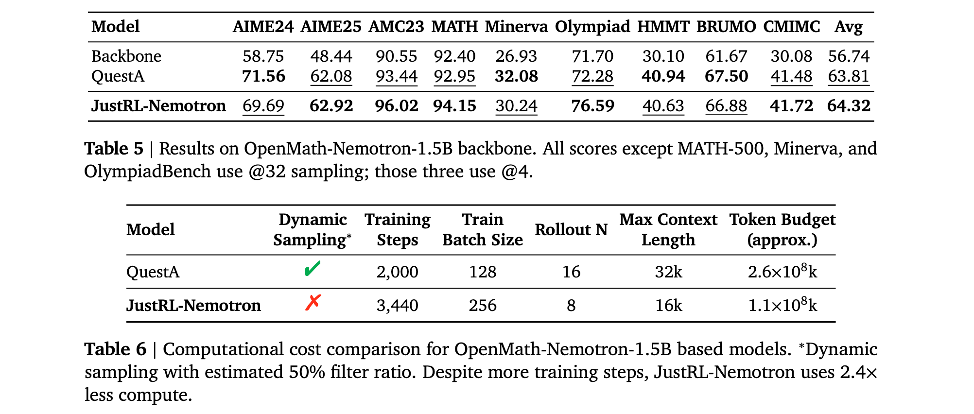 计算效率: 在实现略好平均性能的同时,JustRL使用了2倍较少的计算,而没有设计QuestA中使用的复杂课程。