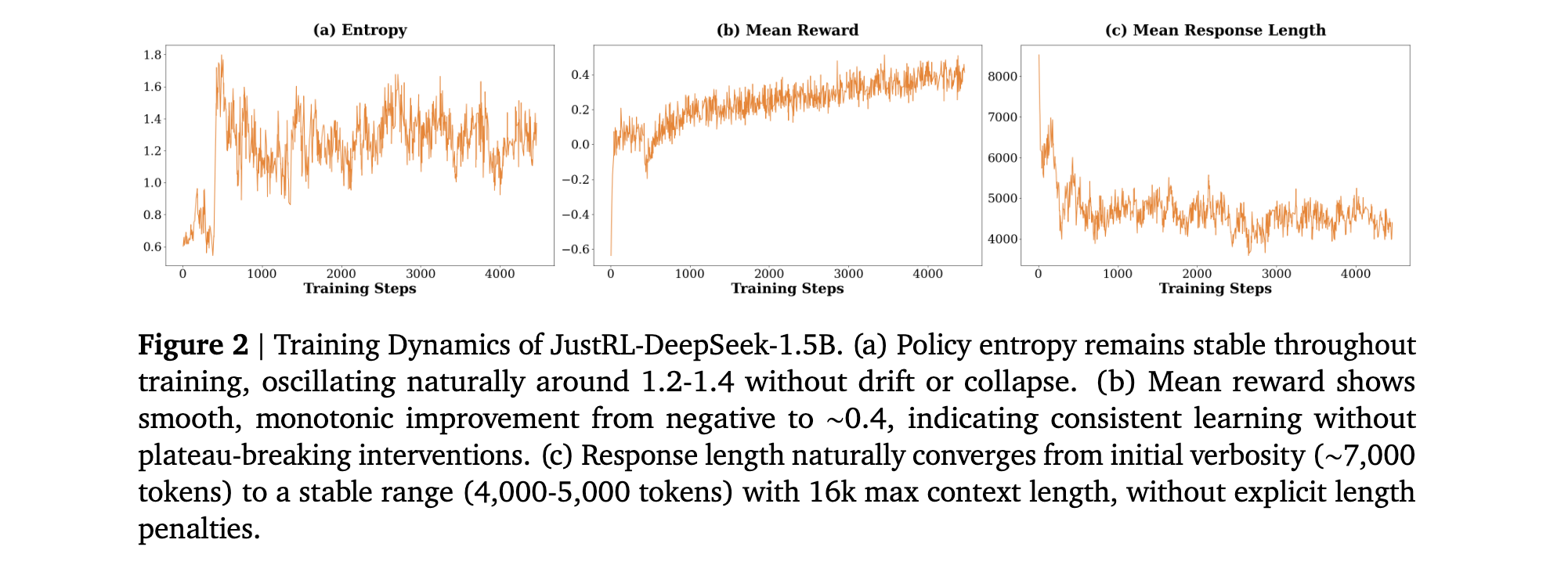 JustRL的训练动态分析揭示了其稳定性的本质。通过对JustRL-DeepSeek-1.5B在4000训练步骤中的三个关键动态跟踪:平均训练奖励、策略熵和平均响应长度,研究者发现: