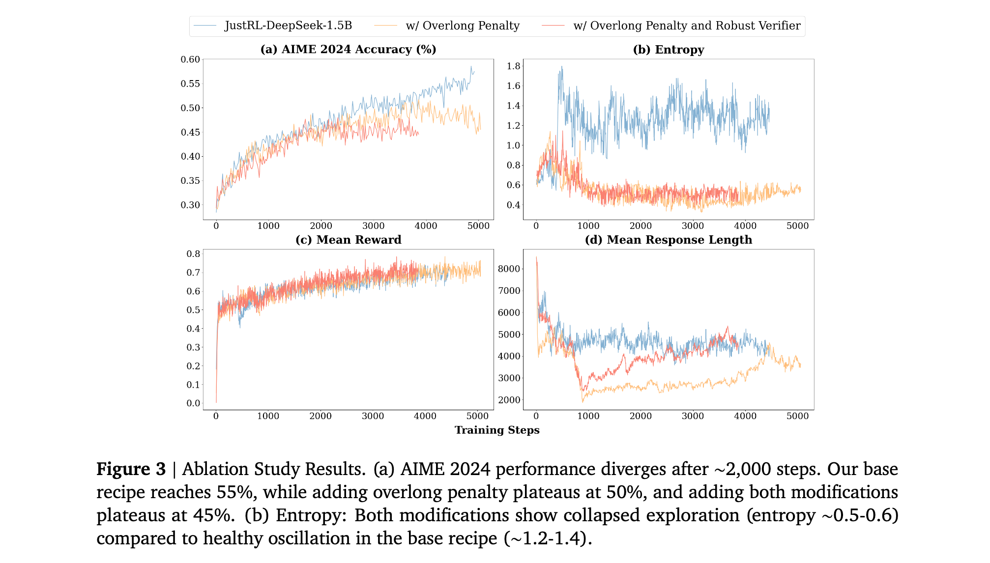 结果显示两种修改都降低了性能:添加过长惩罚在AIME 2024上平台期达到50%(对比基线55%),添加两种修改平台期达到45%。