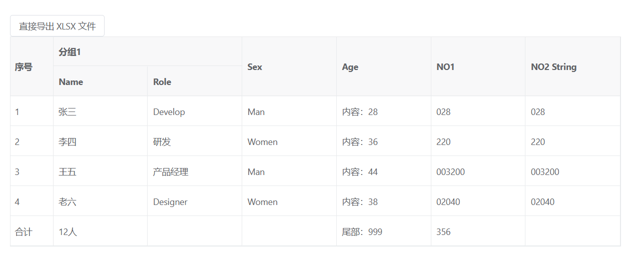 { id: 10001, name: '张三', role: 'Develop', sex: 'Man', age: 28, no1: '028', no2: '028' },