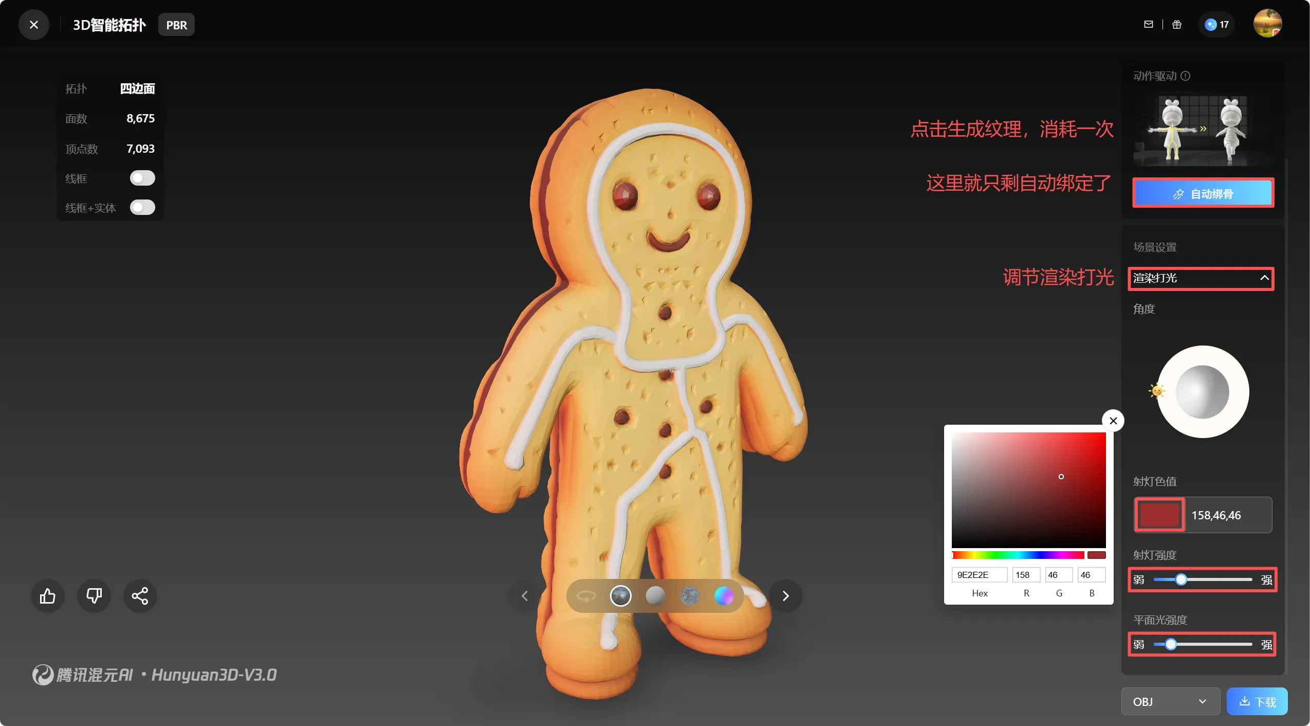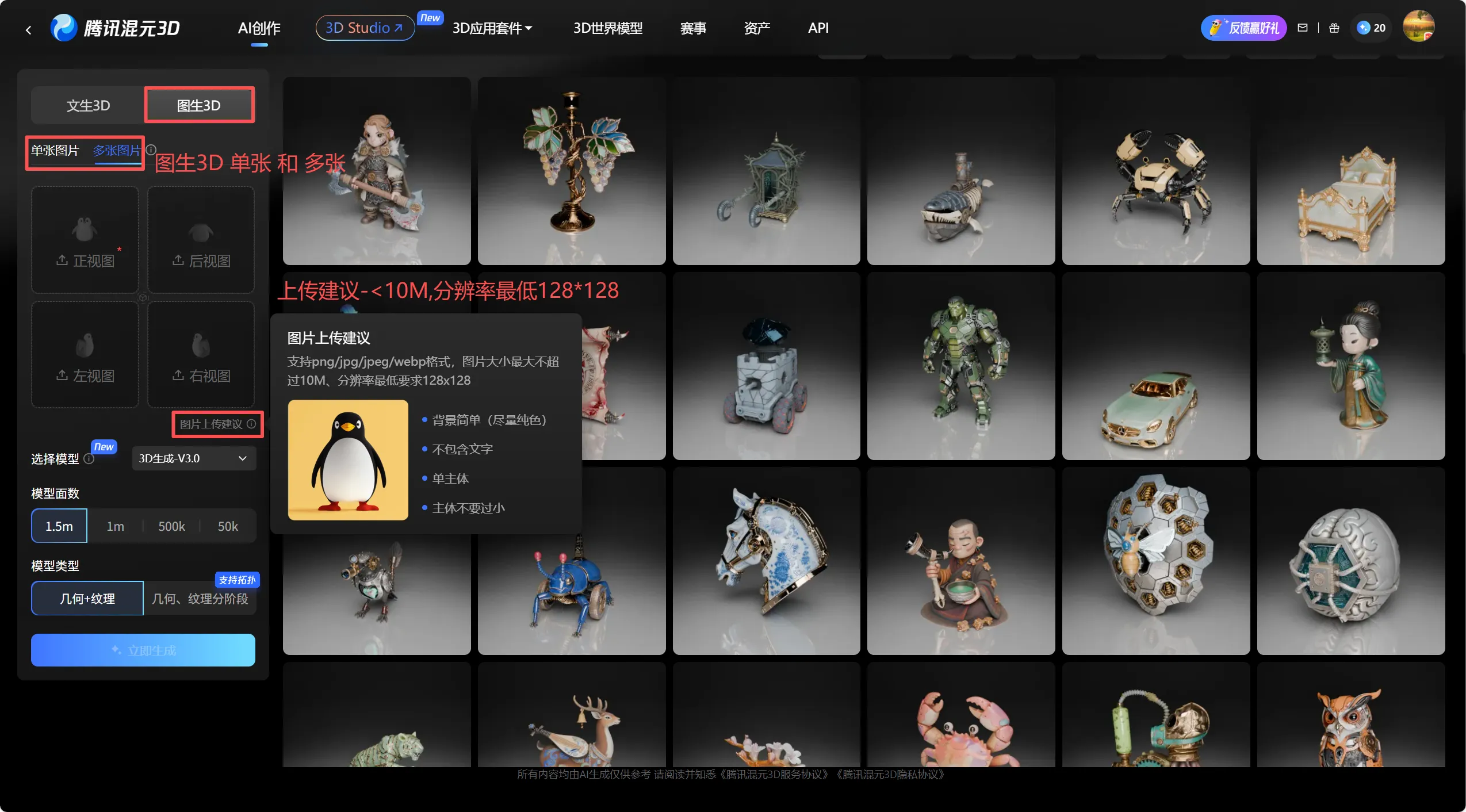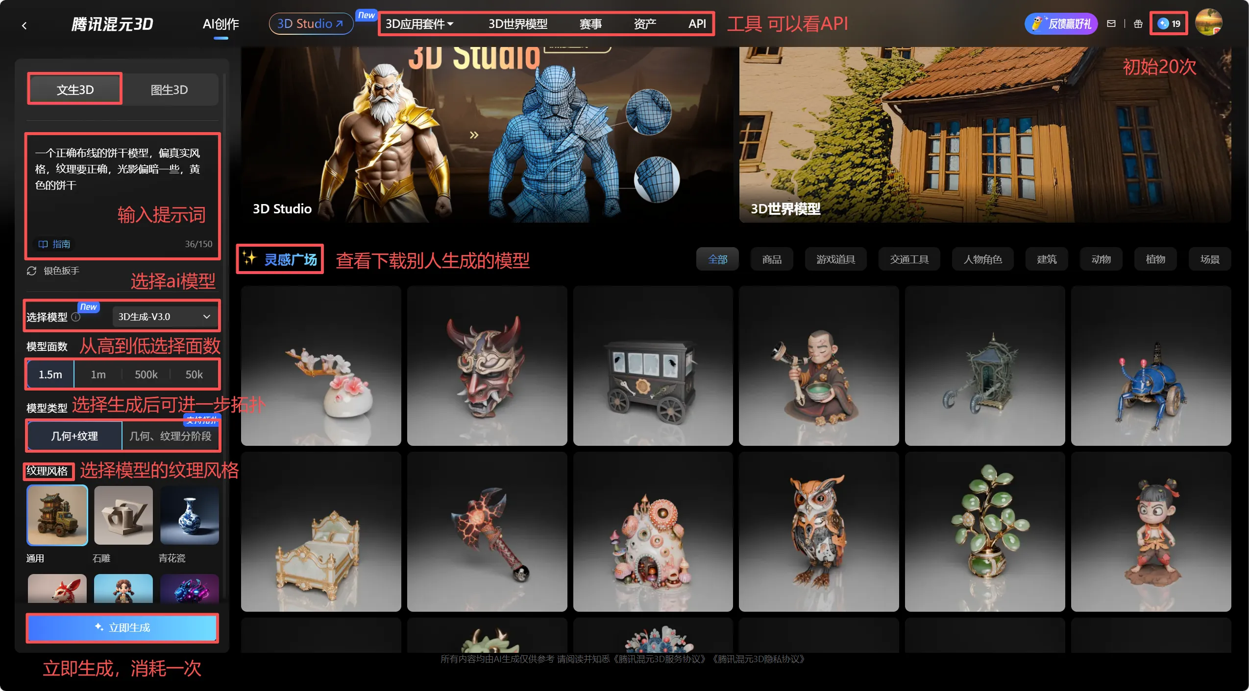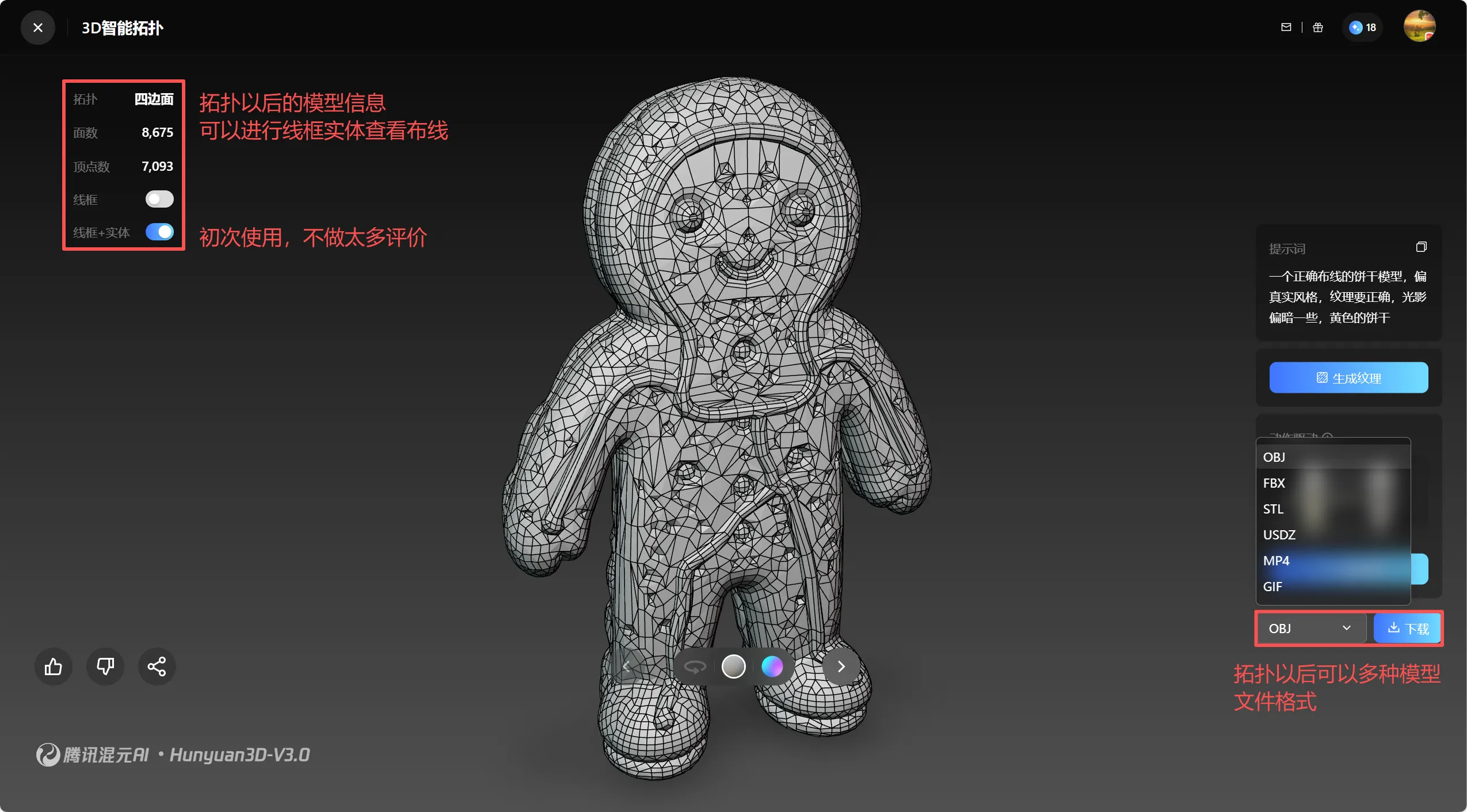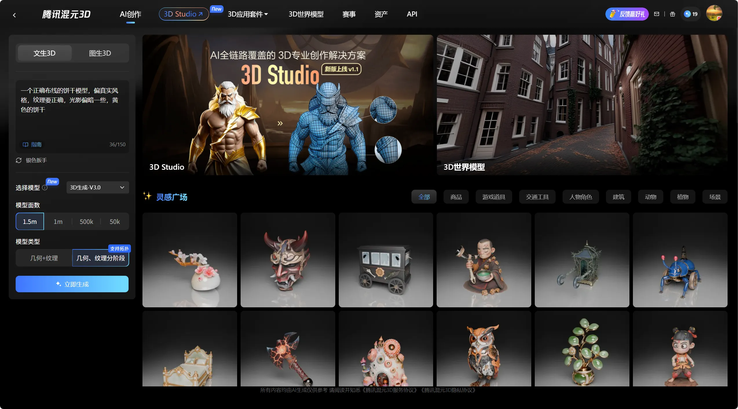 试了一下,腾讯混元3d,整体有工作流,配合建模软件和游戏引擎可以高效率完成场景。灵感广场基本上都是图生3D,文生3D较少,拓扑功能完成后,可以灵活调节模型面数和布线。而且支持大部分模型文件格式,fbx、obj、stl、glb等。