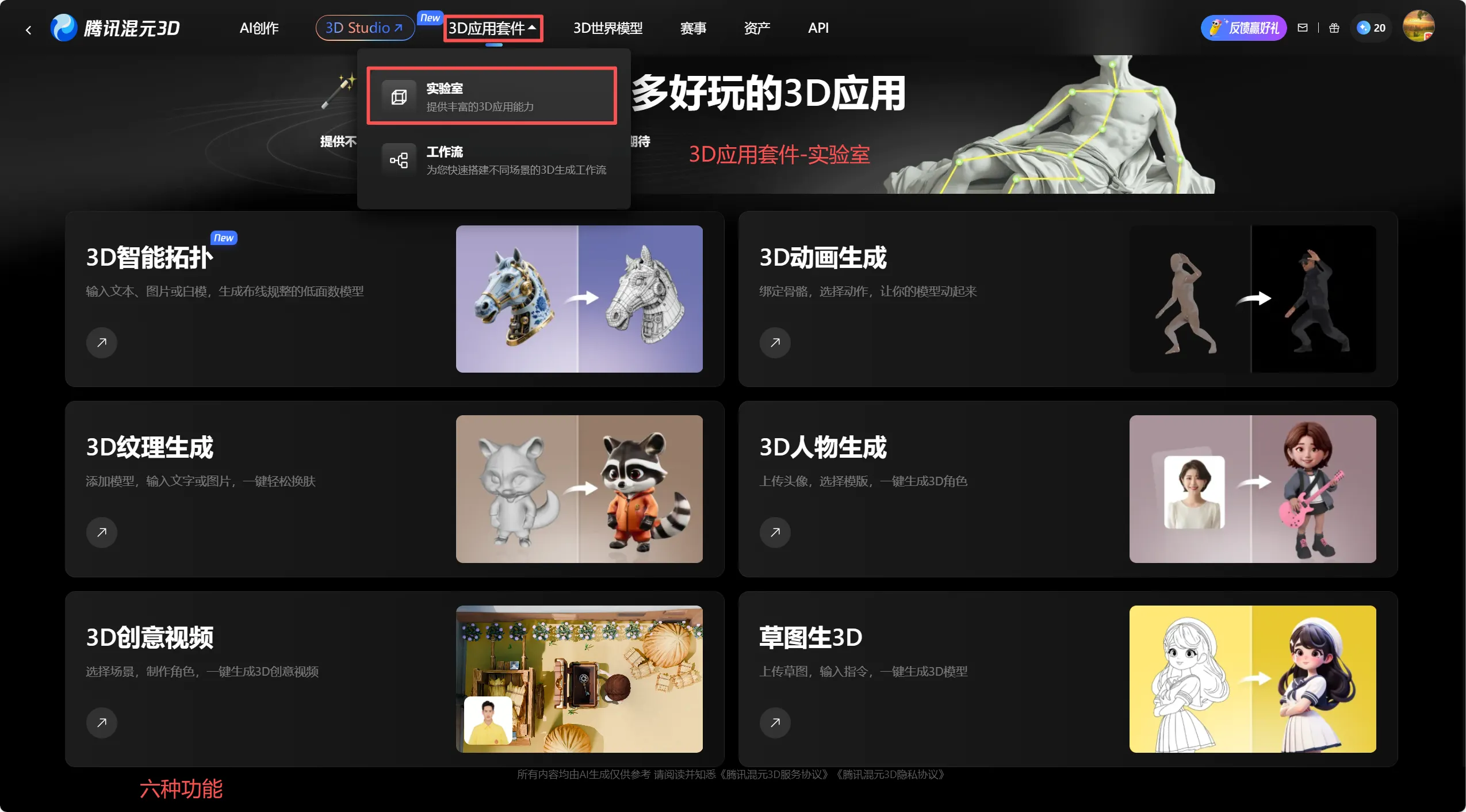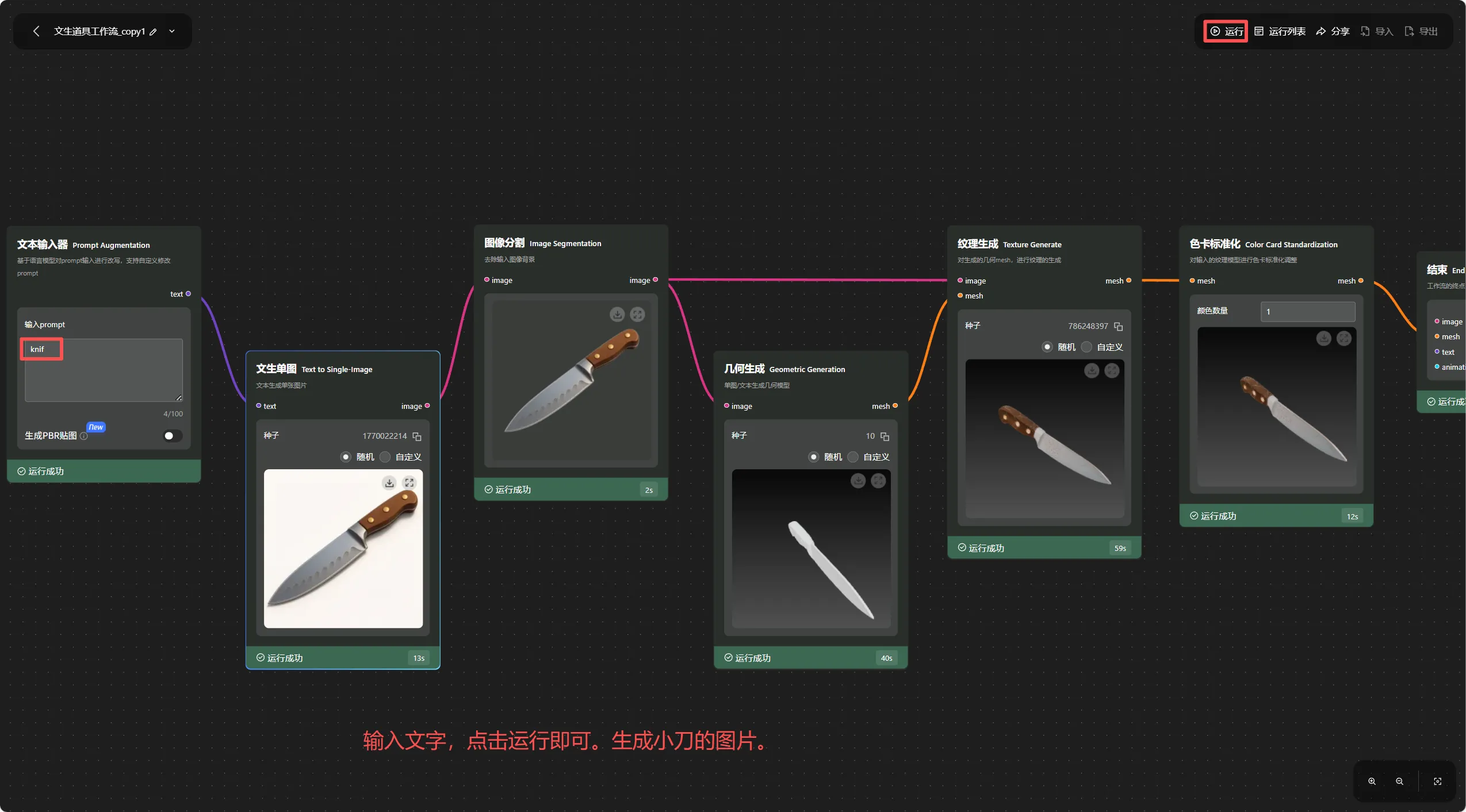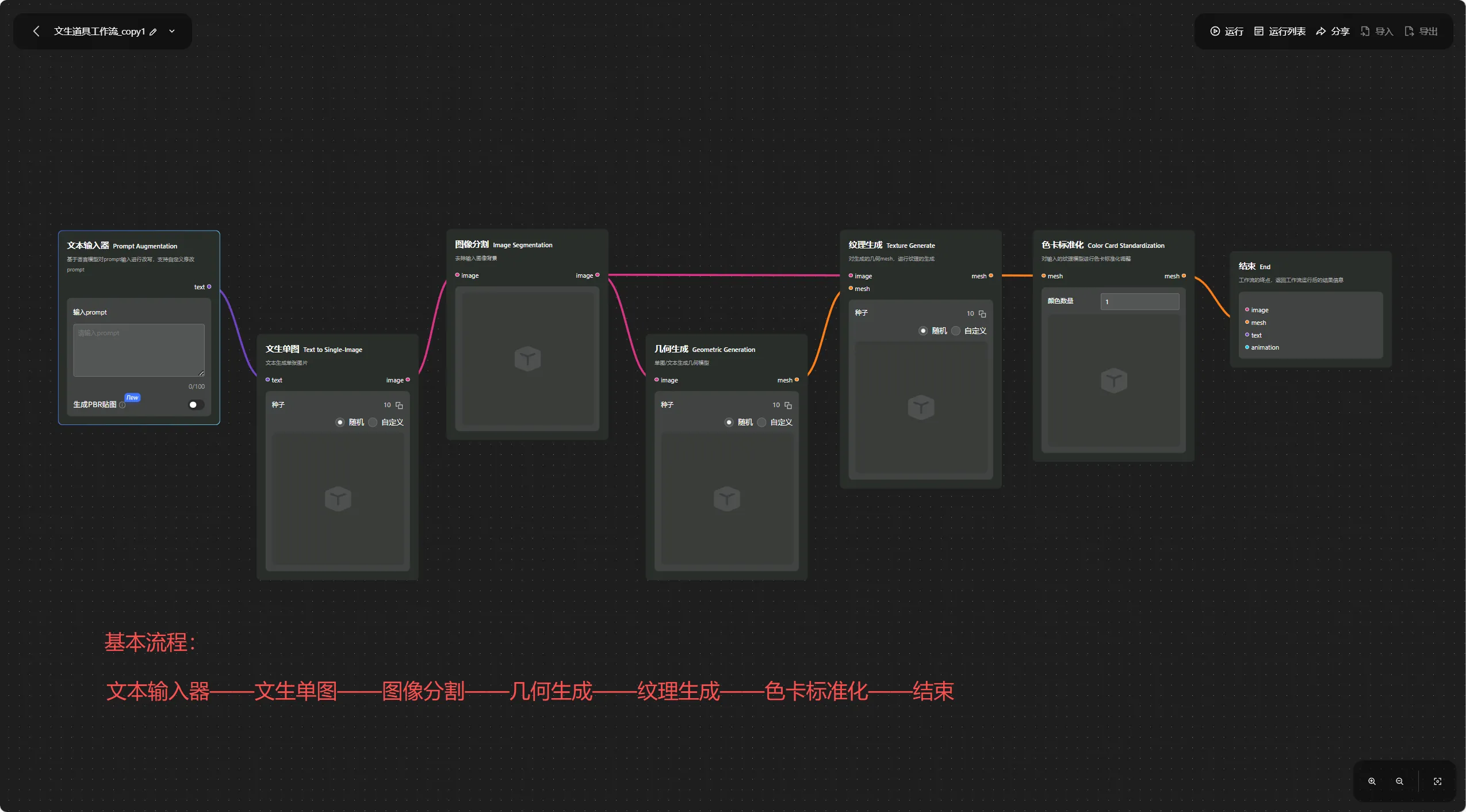 功能集,其实这就是一个工作流,从生成原型原画开始,然后使用图生3D模型,生成纹理,拓扑,绑定动画,导出,一气呵成。