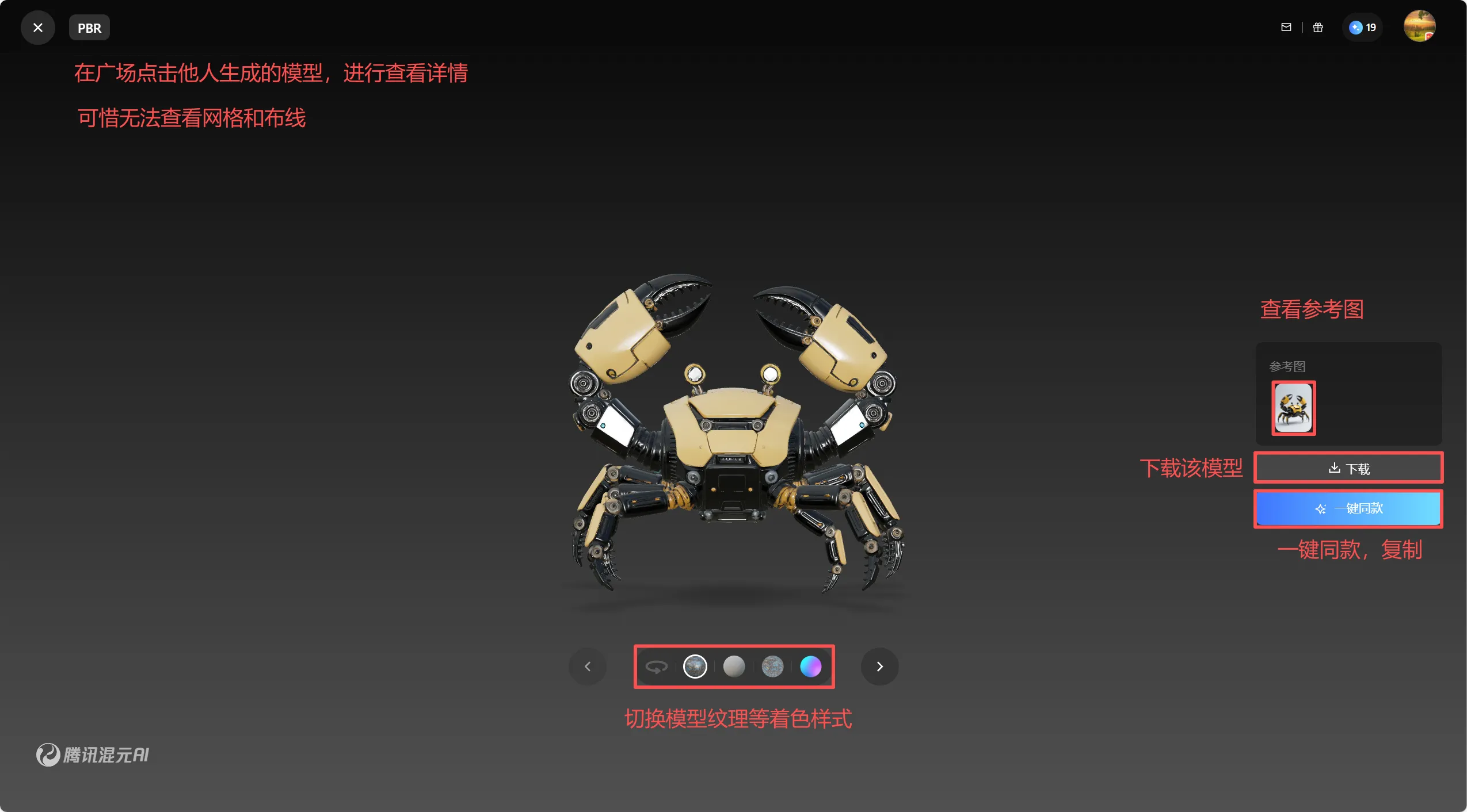 这里可以看到有很多的其他使用者发布的模型,查看详情,也可以下载。下载默认glb格式。