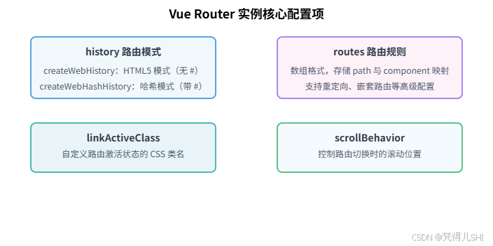 路由实例是路由系统的大脑,所有路由规则、全局配置都通过它定义。下面以 Vue 3 为例,拆解完整的路由实例创建流程(Vue 2 用法类似,差异会标注):