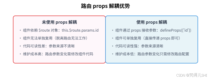 上面两种接收参数的方式都需要用到 $route.params 或 $route.query,这种写法的问题是组件与路由强耦合------ 组件必须依赖路由对象才能获取参数,无法单独复用。