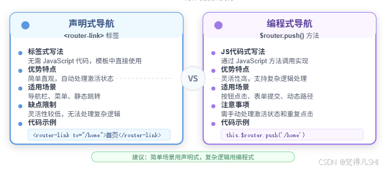 声明式导航通过 <router-link> 标签实现,无需写 JS 代码,适合静态跳转场景(如导航栏、菜单)。