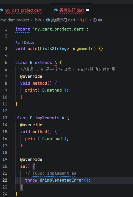 修饰符关键字出现在类或mixin声明之前。例如,编写抽象类定义了一个抽象类。可以出现在类声明之前的修饰符的完整集合包括: