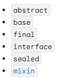 2.(可选)base、interface、final 或 sealed 中的一个,用于描述其他库对该类进行子类型化时的限制。