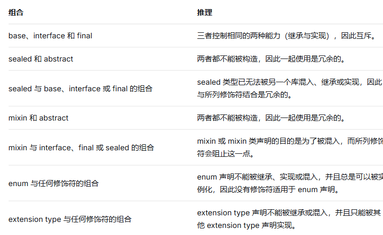 ・interface(接口)、final(最终的)或 sealed(密封的)与 mixin(混入)。这些访问修饰符会阻止混入。