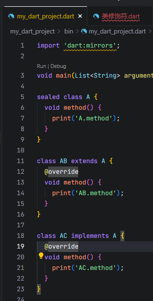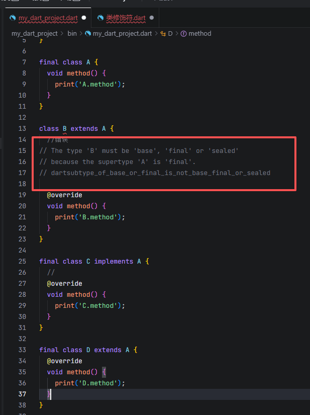在同一个dart文件中,final类也可以被实现和继承,但必须使用 base final sealed 修饰